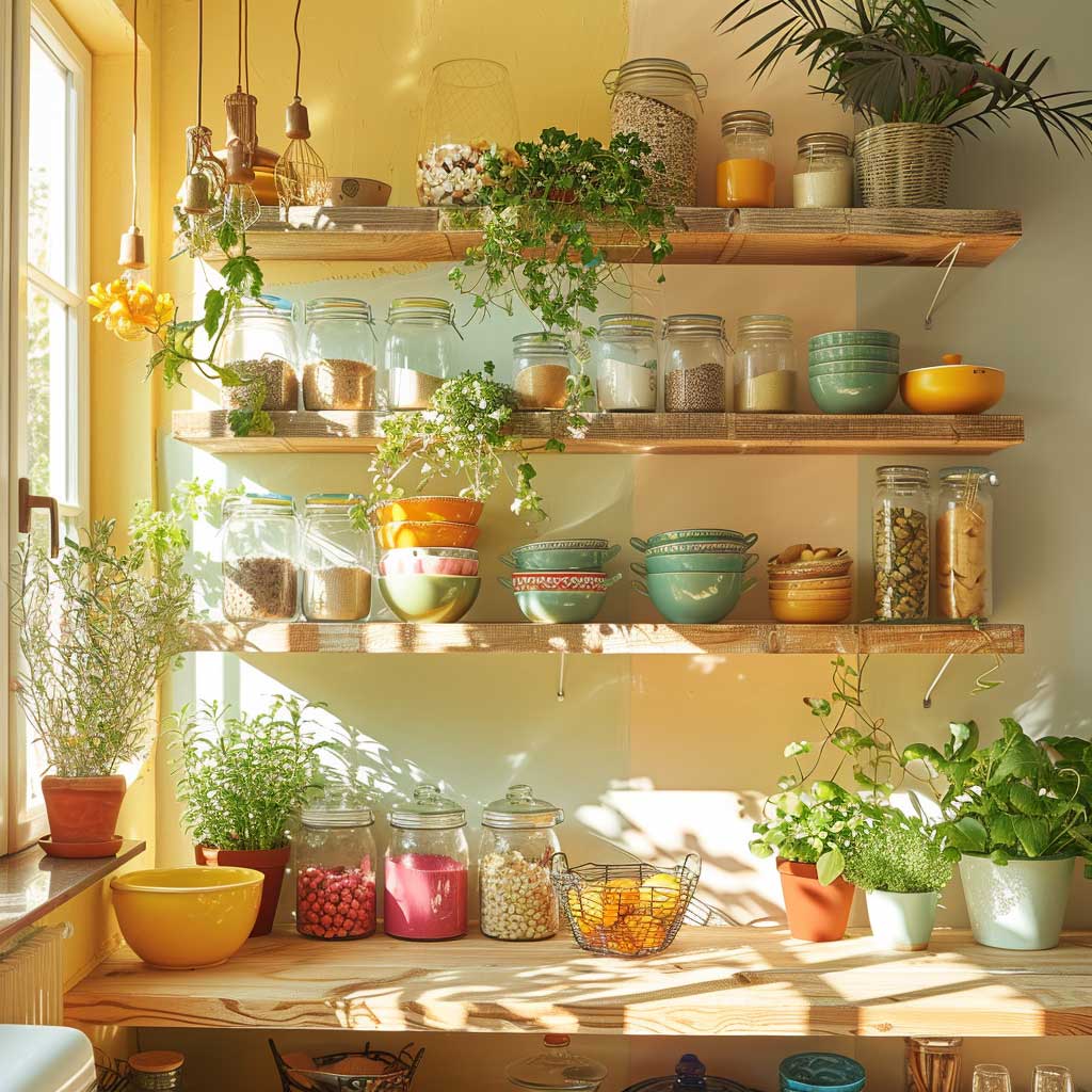 A bit of greenery, such as small potted plants or some herbs, in the shelves enhances the texture and life in the kitchen. Against the light wood and pastel backgrounds, these green accents bring just enough of an interesting edge to the space so that focal points are created, pulling the eye.
