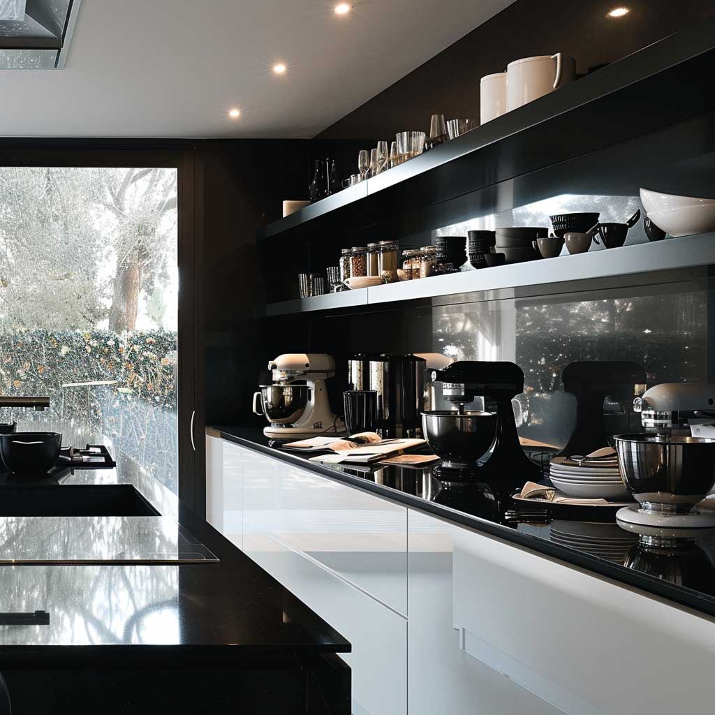 The stainless steel appliances in this kitchen design hold the clean lines and polished surfaces of the shelves for an appareled yet discreetly arresting look. The big windows in the kitchen help in this minimal approach, filtering much natural light to reflect off glossy surfaces for a very bright and airy ambiance.