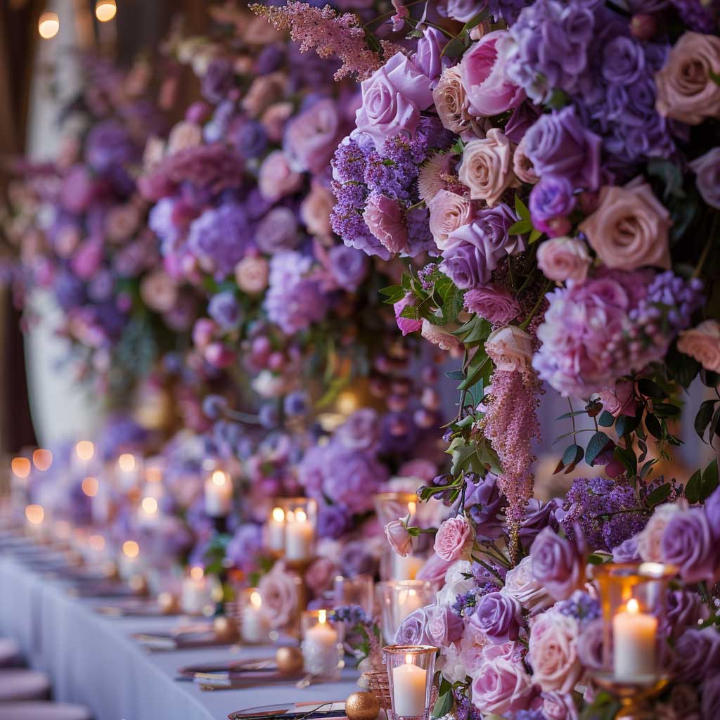 Lighting also plays a significant role in highlighting the beauty of purple floral arrangements. Soft, warm lighting can enhance the richness of the purple hues, creating a romantic and intimate atmosphere. Fairy lights and candles can be strategically placed to illuminate the flowers, making them glow and stand out.