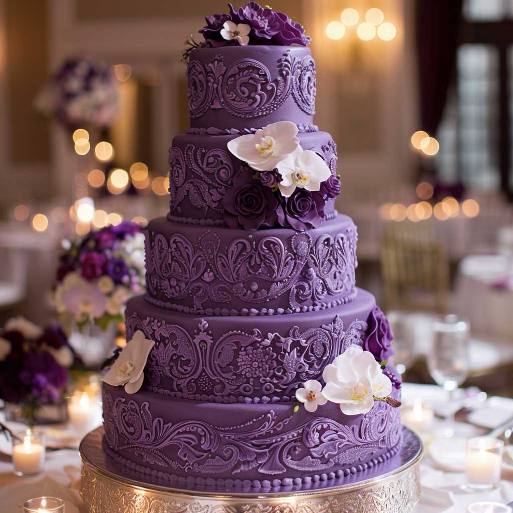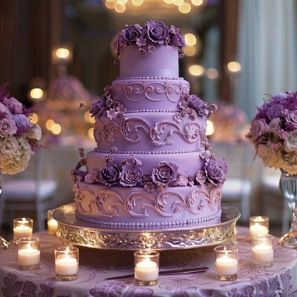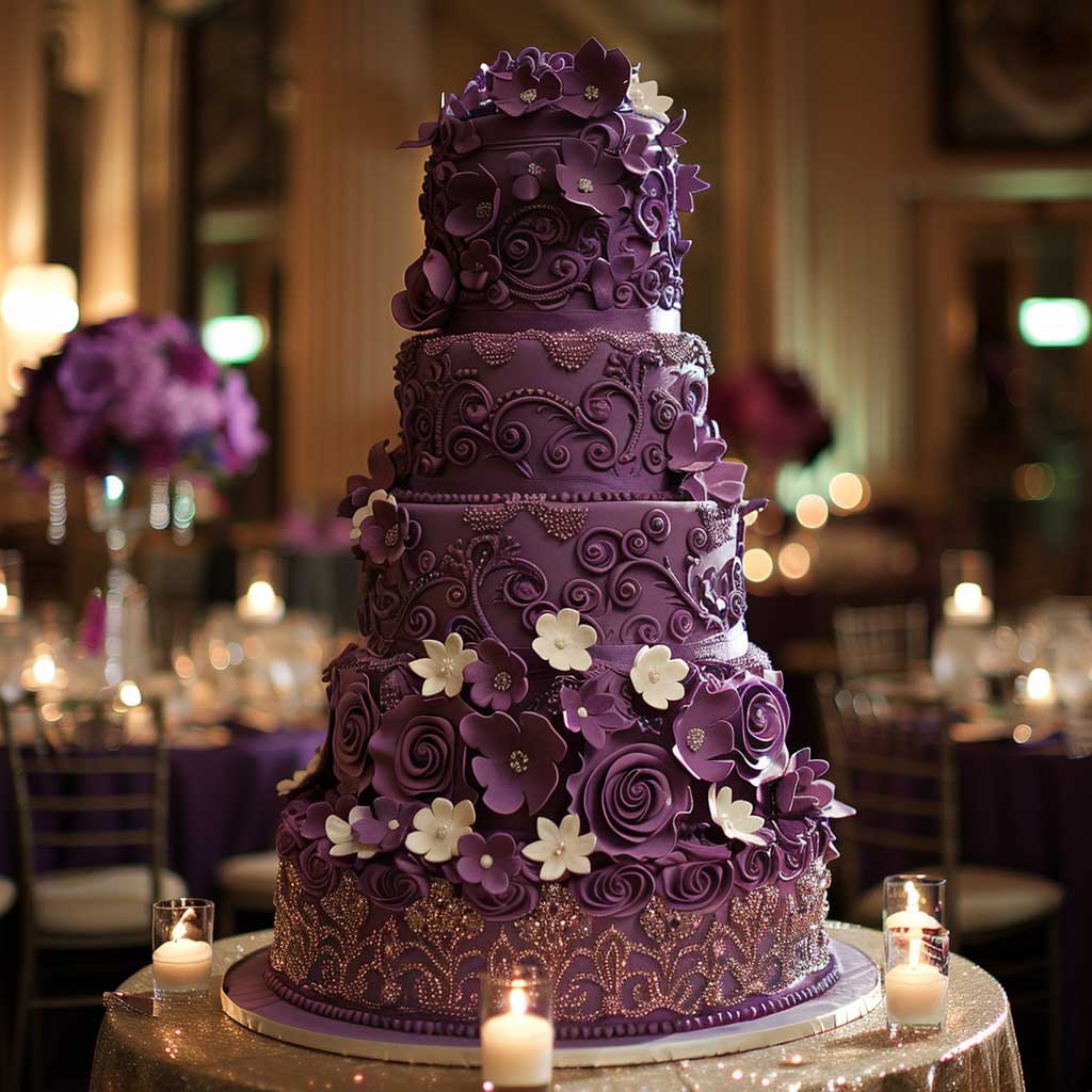 A purple-themed wedding cake is a striking centerpiece for your reception, showcasing the elegance and sophistication of the purple wedding theme. This cake can be as simple or elaborate as you desire, with endless possibilities for design and decoration.