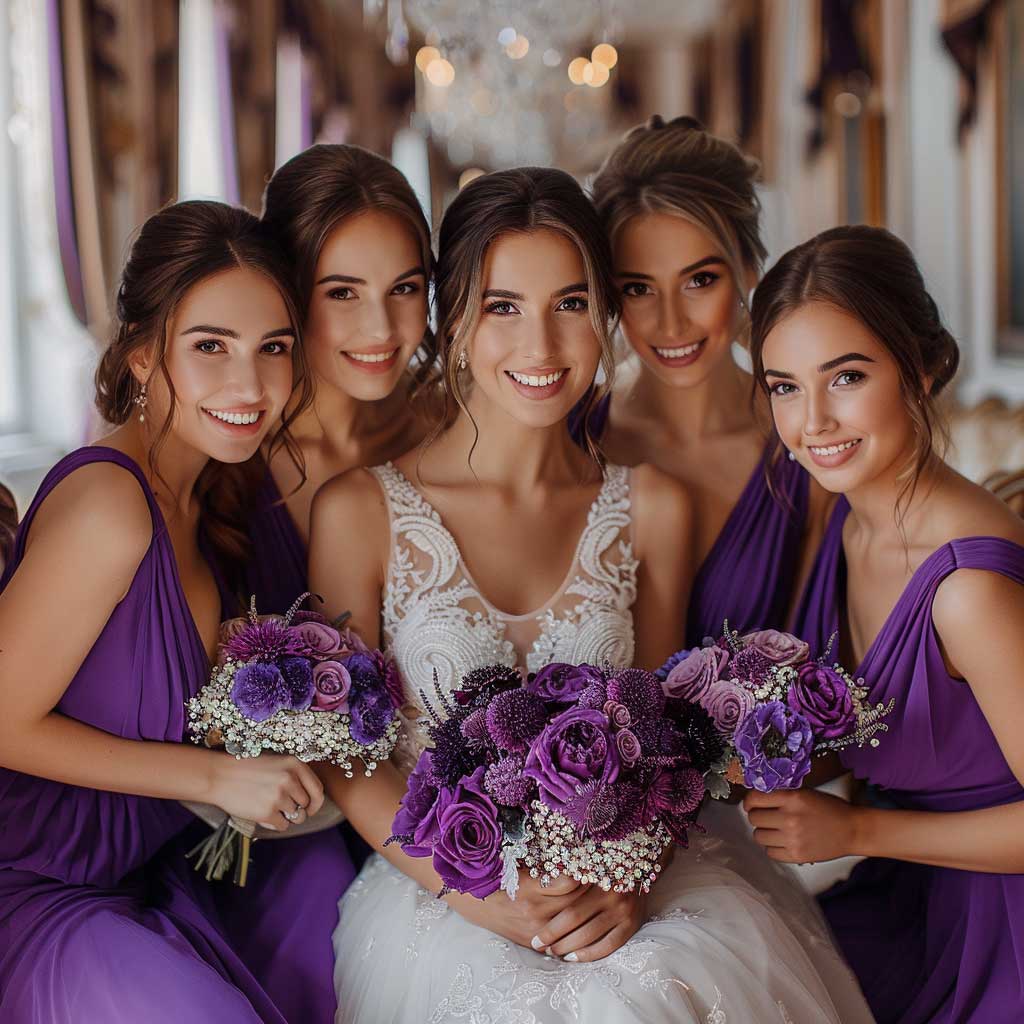 Ensure that the bridesmaids’ dresses are photographed in a beautiful setting, such as a garden or historic venue, where the colors can stand out. The combination of the violet dresses and the picturesque surroundings will create stunning photos that capture the essence of the purple wedding theme.