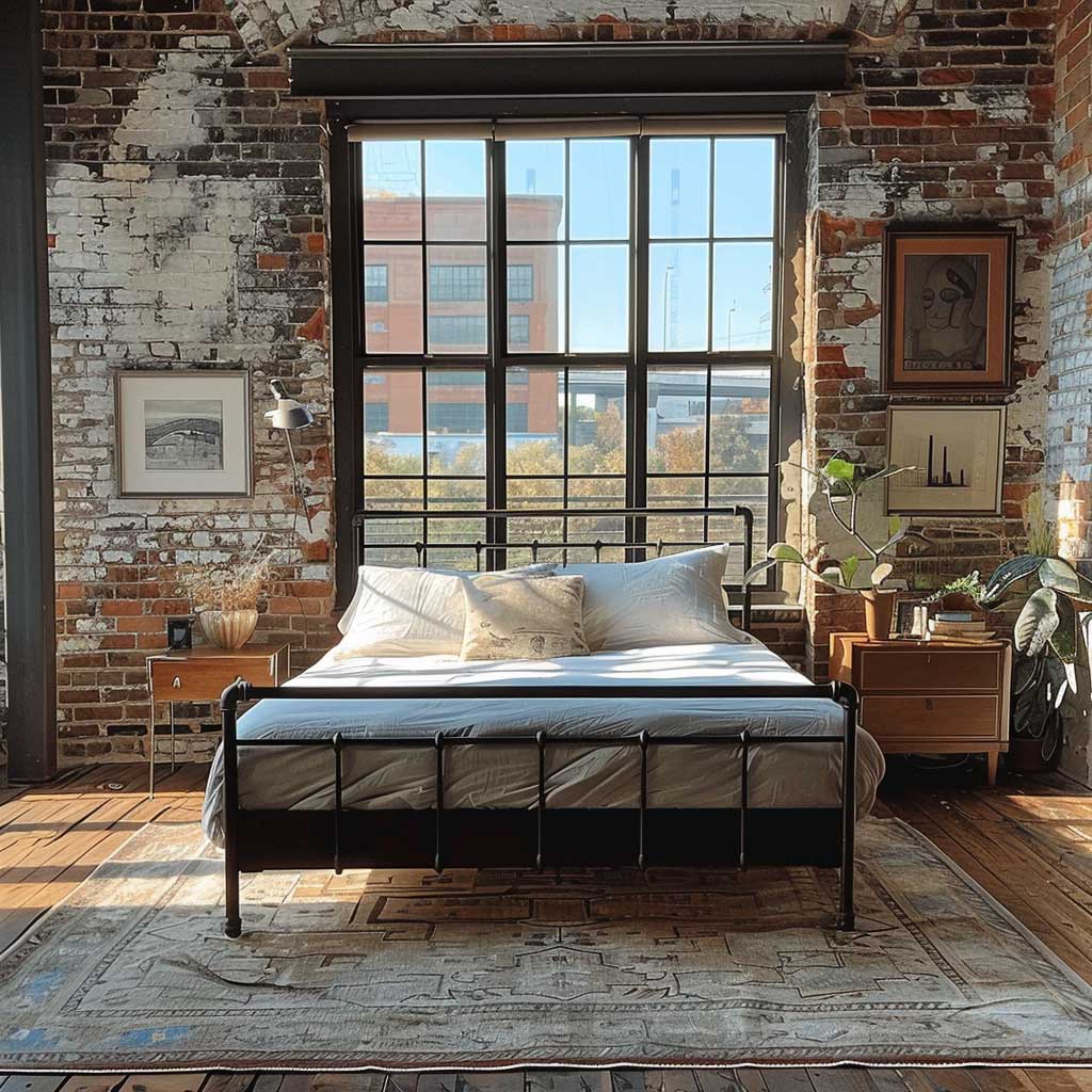 For the flooring, polished concrete or dark hardwood can enhance the industrial vibe. Add a textured rug in a complementary color to introduce comfort and break up the starkness of the floor. This rug also serves as a visual anchor, grounding the bed frame and providing a cozy underfoot feel.