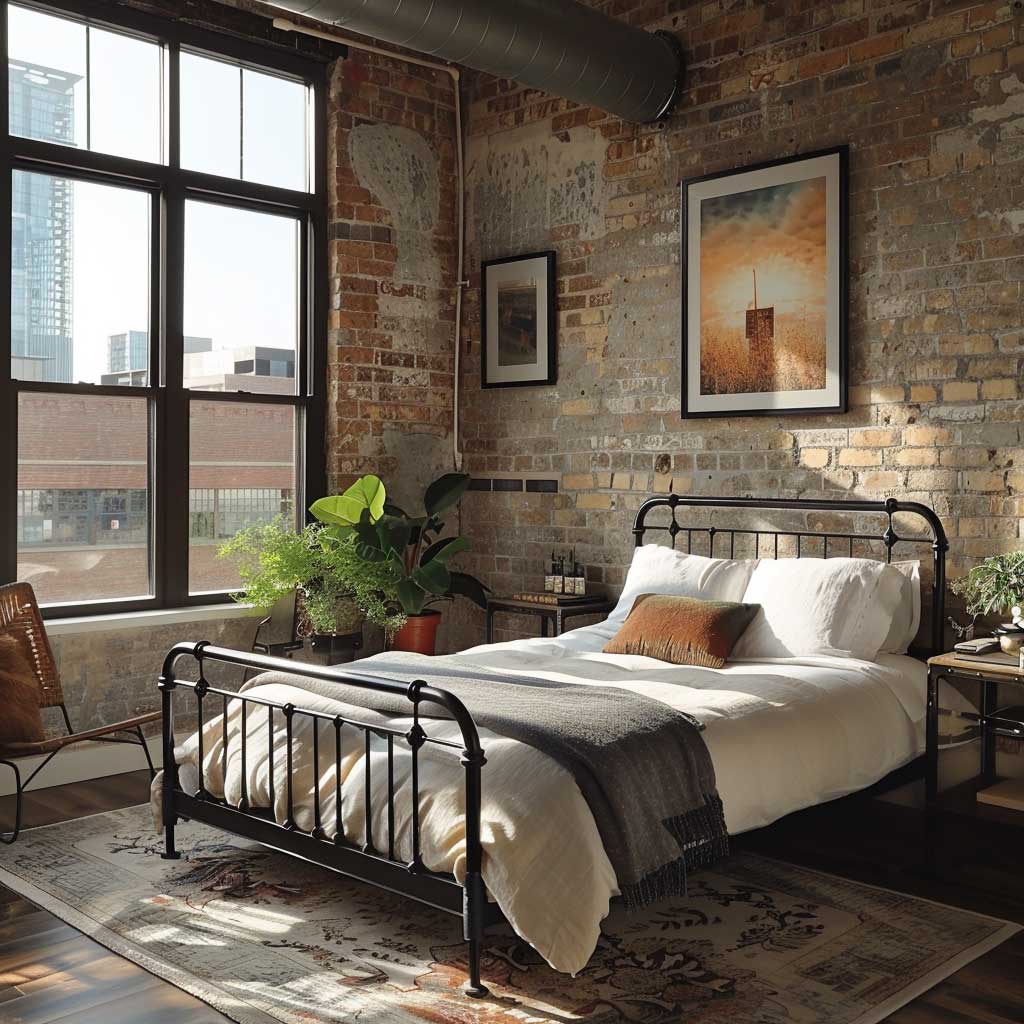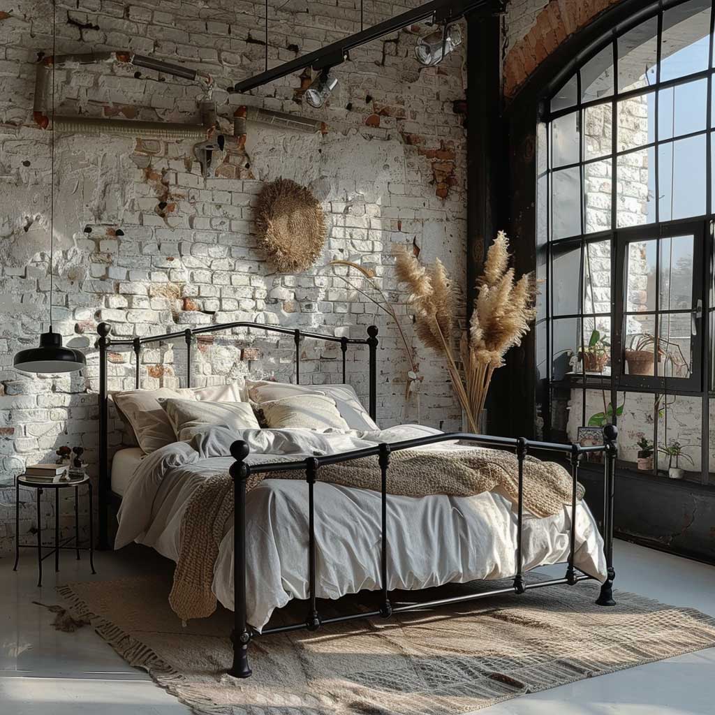The centerpiece of this industrial chic bedroom is a striking black metal bed frame. Its robust structure and clean lines serve as a perfect foundation for the industrial aesthetic. Paired with exposed brick walls, the bed frame stands out, adding a touch of elegance to the raw, unfinished look of the brick. This juxtaposition creates a dynamic visual contrast that is both captivating and harmonious.