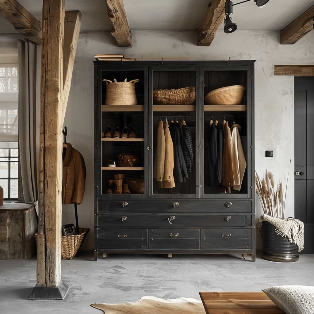 Exposed beams add character and depth to the room, reinforcing the industrial vibe. The raw, unfinished look of the beams complements the black steel wardrobe and creates a visually appealing backdrop. Together, these elements establish a strong, cohesive design that is both stylish and functional.