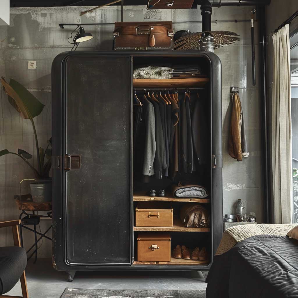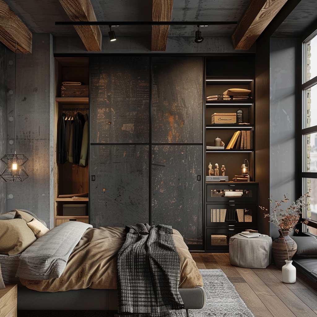 Lighting plays a crucial role in creating the right ambiance. Industrial-style pendant lights with exposed bulbs and metal finishes can add both illumination and style to the space. These lights highlight the wardrobe and other key elements, enhancing the raw elegance of the design.