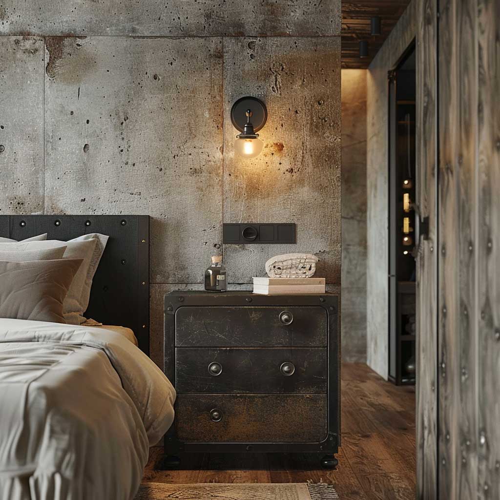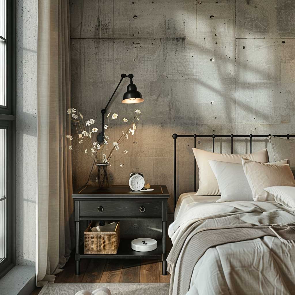 Concrete walls create a perfect backdrop for this setup. The rough texture and neutral color of the concrete walls contrast beautifully with the black iron nightstand, highlighting its presence in the room. This combination also ensures that the space remains cohesive and true to the industrial theme.