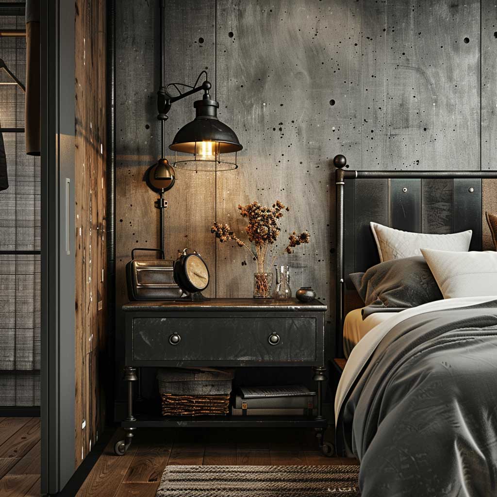 Minimalistic decor is key to maintaining the elegance of this setup. Choose functional yet stylish items for the nightstand, such as a vintage alarm clock or a small potted plant in a black metal pot. These items should enhance the nightstand’s industrial appeal without cluttering the space.