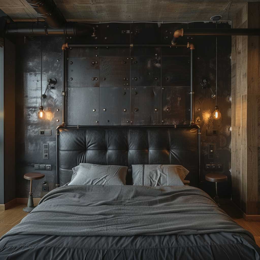 A black leather headboard with metal accents serves as a striking centerpiece in this industrial chic bedroom. The smooth, luxurious texture of the leather contrasts with the raw, industrial elements, creating a harmonious balance between elegance and ruggedness. The metal accents add a touch of sophistication, reinforcing the industrial theme while elevating the overall design.