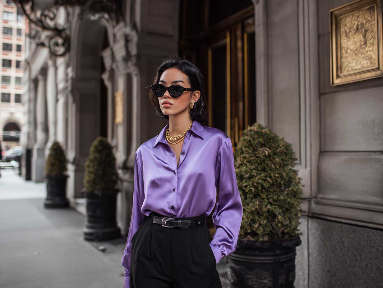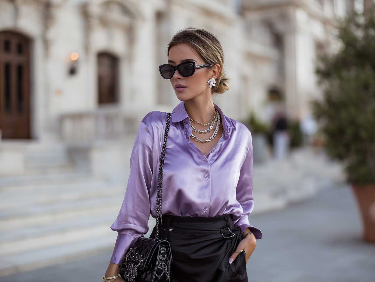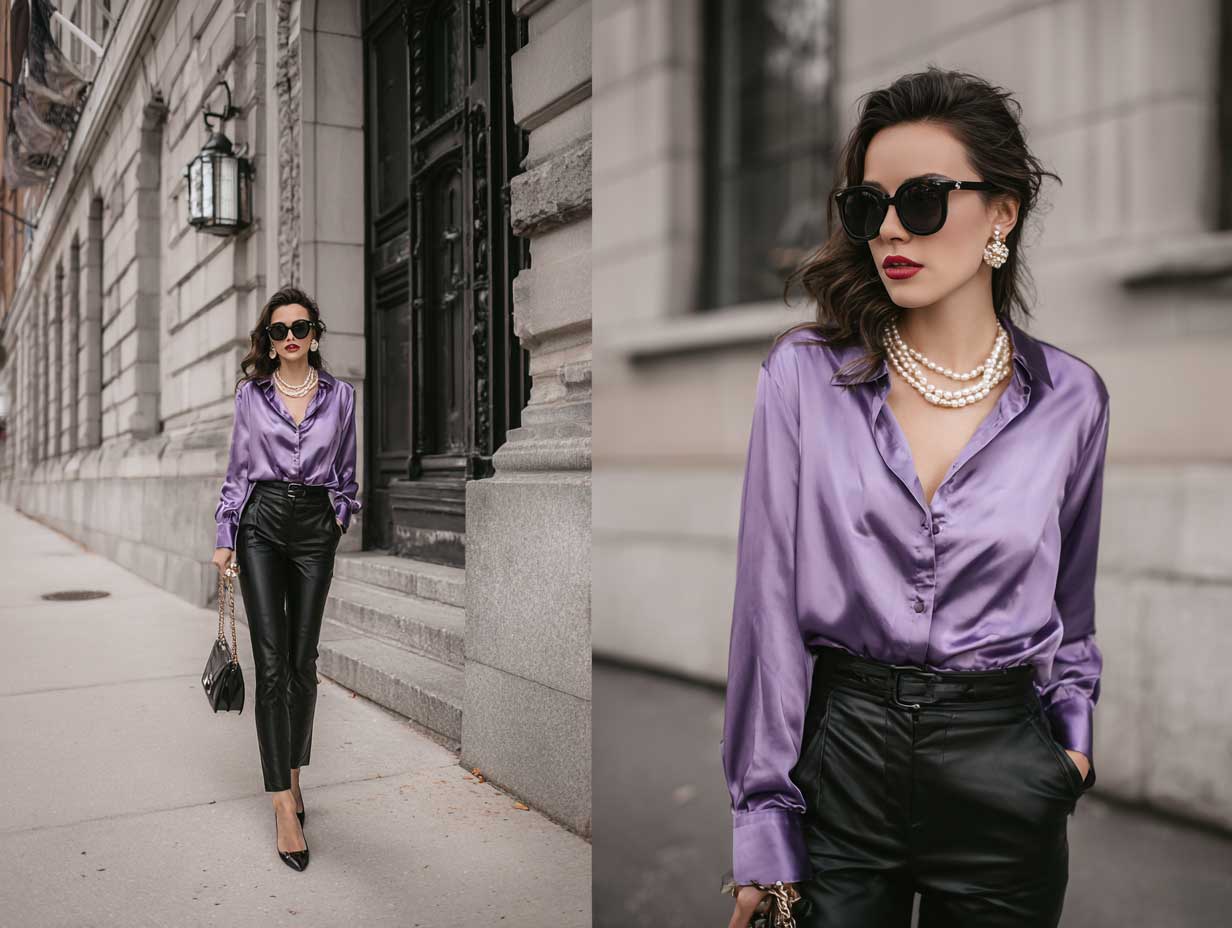 The timeless depth of black and the ethereal softness of lilac come together in a color pairing that is both sleek and modern. When combined with satin’s glossy finish, these tones elevate any outfit into a conversation starter. Whether styled for daytime polish or nighttime glamour, satin shirt outfit ideas in black and lilac offer a wide range of expressions—from edgy minimalism to dreamy romanticism. These colors don’t compete—they complement, creating visual balance and mood-enhancing versatility. Below are three refined combinations that explore how satin can help you harness the best of both hues in fresh and wearable ways.
