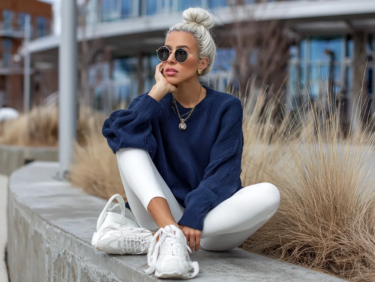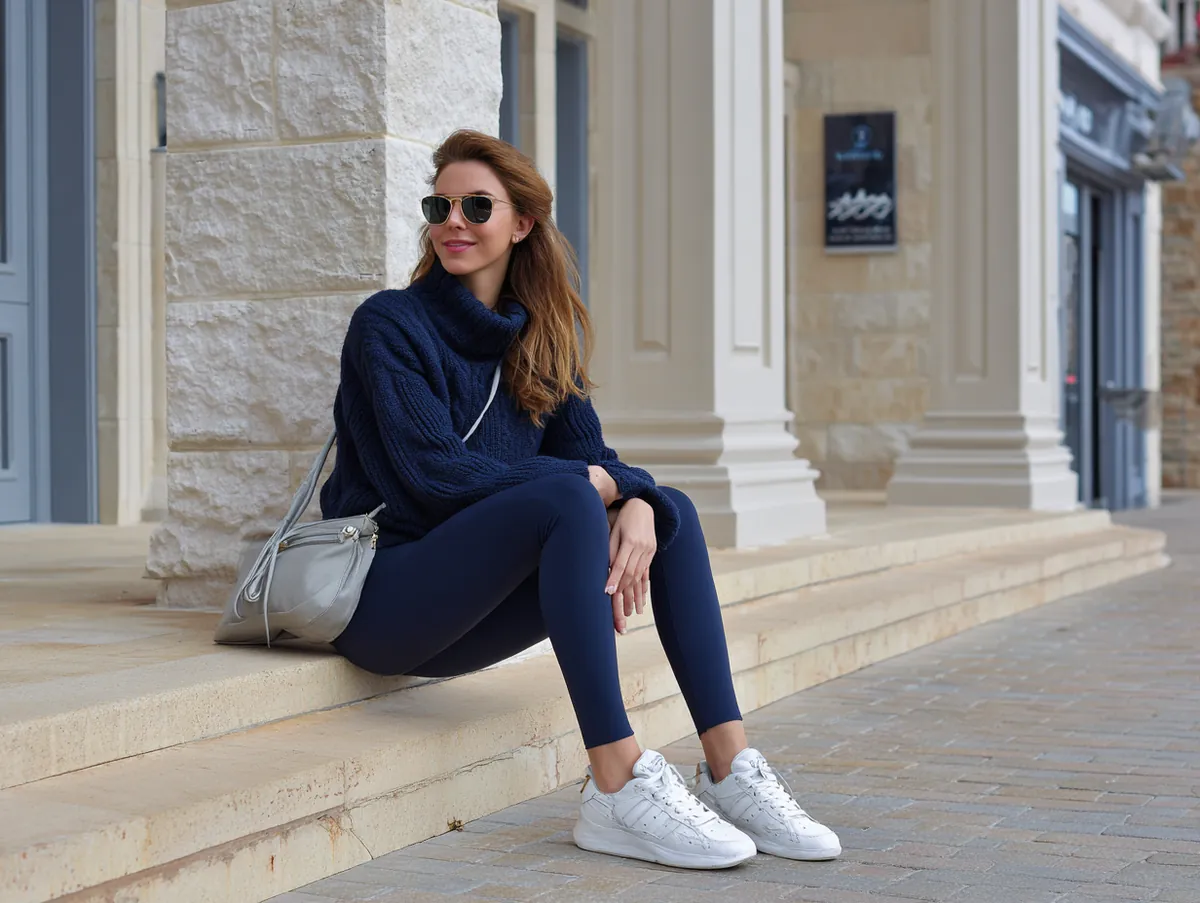 When the weather calls for cozy comfort, pairing white leggings with a navy blue sweater offers the perfect blend of warmth and style. The navy blue sweater not only adds depth to the outfit but also creates a balanced contrast with the bright white leggings. This combination is great for cooler days when you want to stay warm while still looking put together.