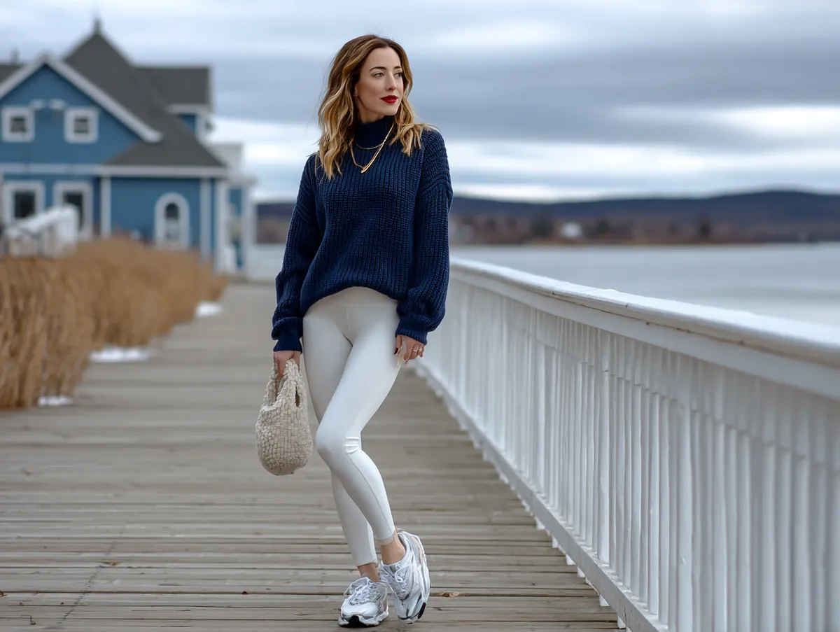 White leggings have a way of adding brightness to any ensemble, making them an excellent choice for balancing darker tones. The navy blue sweater, whether oversized or fitted, adds sophistication, making this outfit ideal for both lounging at home and casual outings. Opt for a chunky knit or a fine merino wool version of the sweater to switch up the texture and feel of the look.
