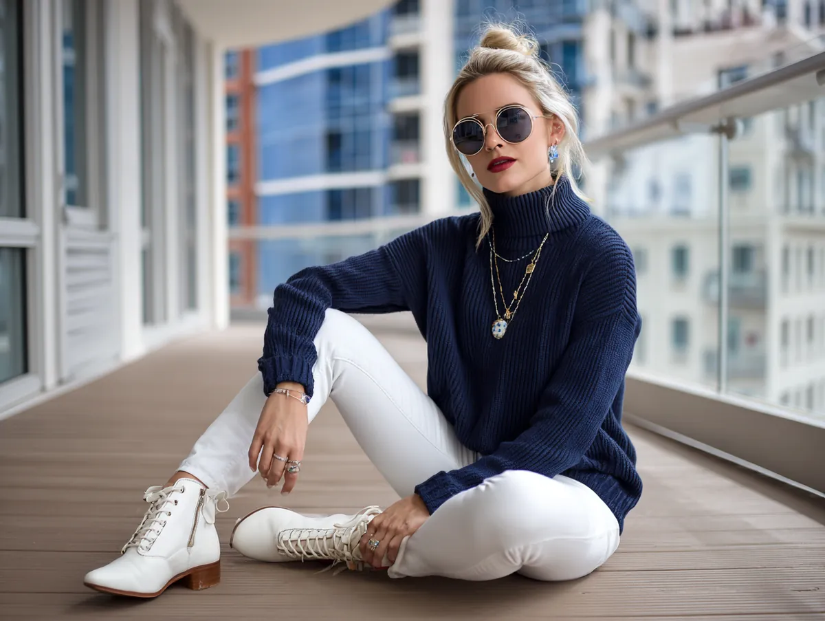 White Leggings Paired with Navy Blue Sweater for a Cozy Vibe