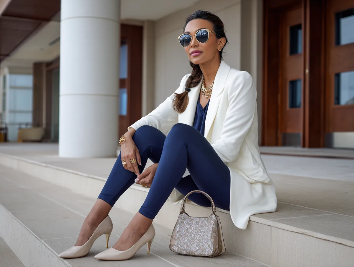The blazer brings structure to the outfit, adding a touch of professionalism without sacrificing comfort. This outfit works well for situations where you want to be comfortable yet look polished. The contrast between the dark navy leggings and the crisp white blazer creates a striking visual effect, making the outfit feel fresh and contemporary.