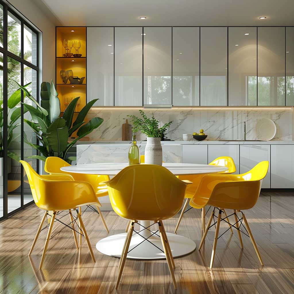 Moreover, the minimalist backdrop of white cabinetry ensures that the yellow chairs stand out, drawing the eye and inviting people to sit down and enjoy. Whether it’s a quick breakfast on a busy morning or a leisurely brunch on the weekend, these chairs add a cheerful touch that can make mealtime more enjoyable. Incorporating elements of nature, like a few strategically placed green plants, adds a fresh, organic feel to the modern decor, balancing the boldness of the yellow with a soft natural green.