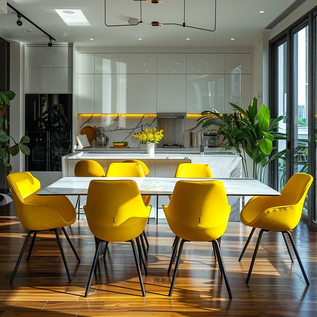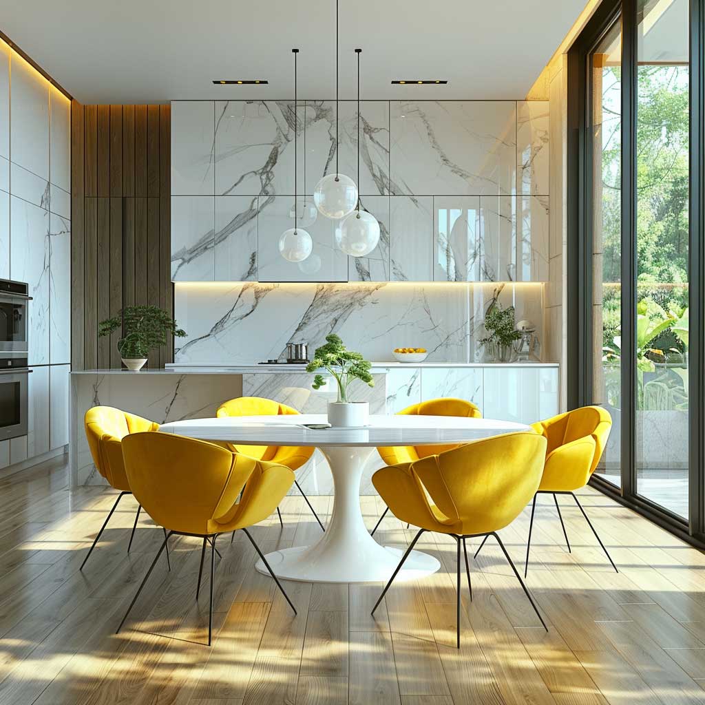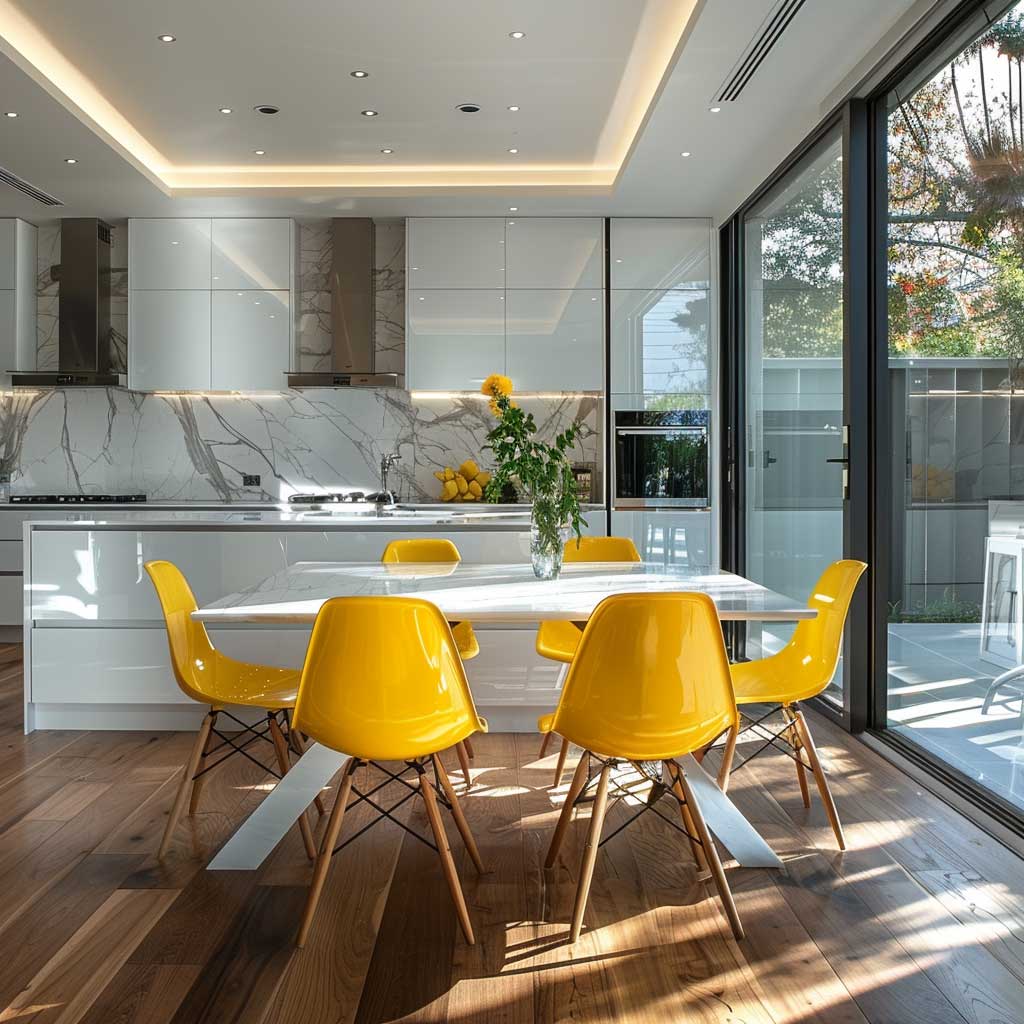 Imagine entering a kitchen where the sunlight gleams off white marble tables, highlighting the vivid yellow chairs that surround it. These chairs aren’t just furniture; they’re statements of style and joy. The natural light that flows through large windows bathes the entire room, reflecting off glossy wooden floors and creating a space that feels both open and inviting. This setting uses color to enhance the mood, proving that design can influence how we feel in our living spaces.