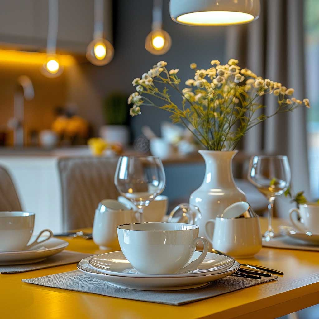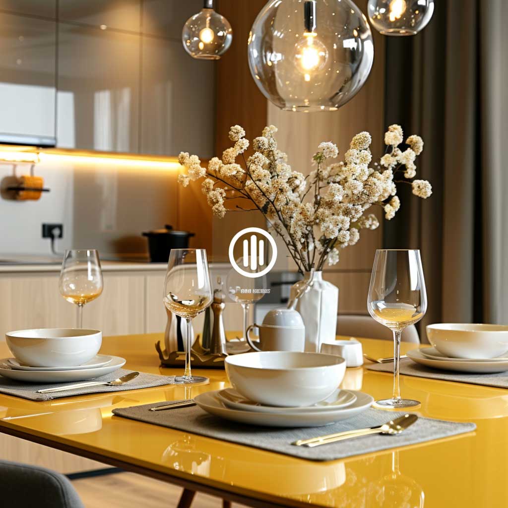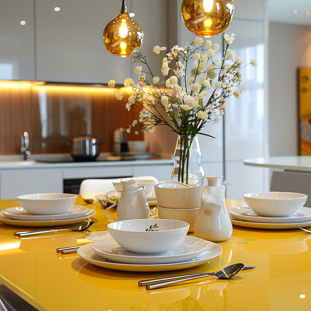 Setting a table in a kitchen where yellow is the accent color can turn everyday meals into special occasions. In this kitchen, the focus is on a yellow table that brings a sense of modern elegance to the dining area. The table is set with white ceramic plates and silver cutlery, showcasing a simple yet sophisticated style. The elegance of the table setting is enhanced by the overall decor, which features muted background colors and subtle decorative elements.