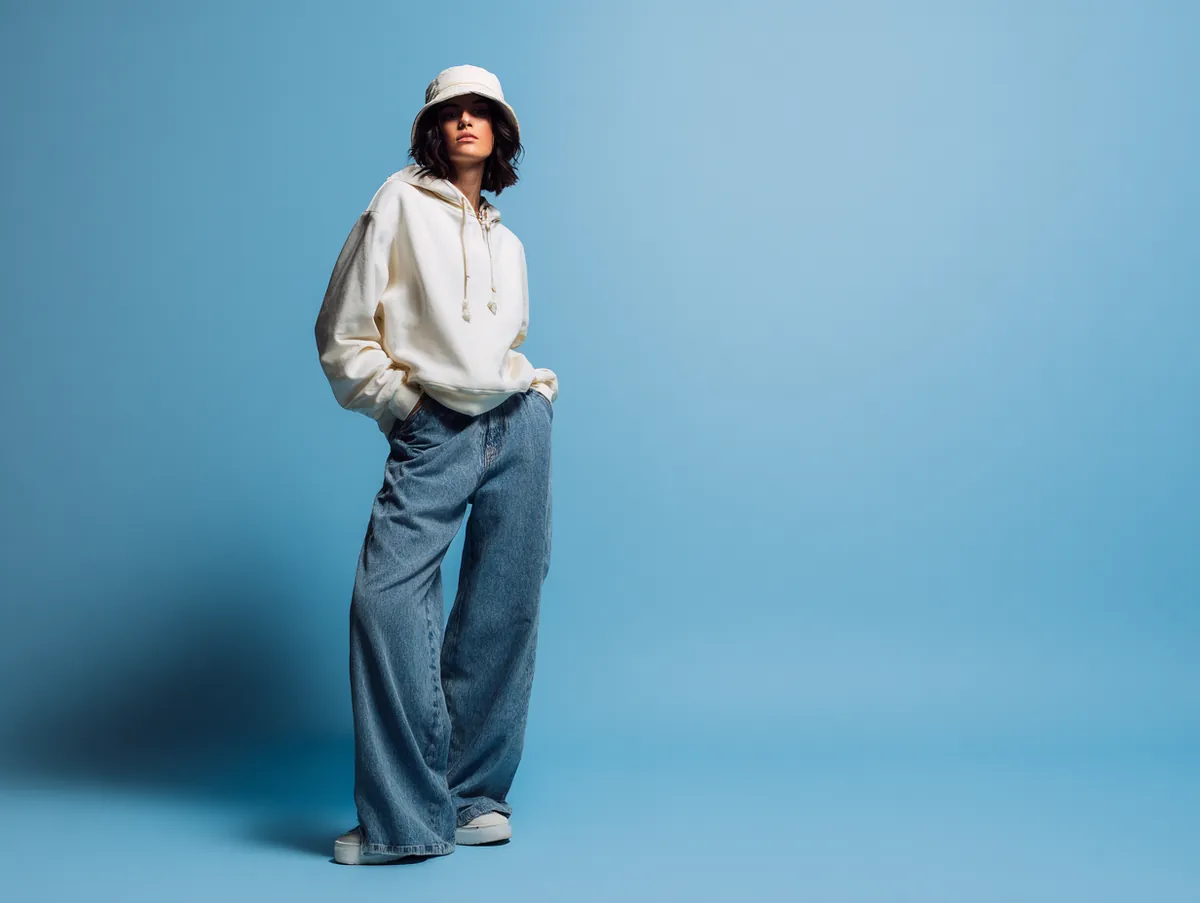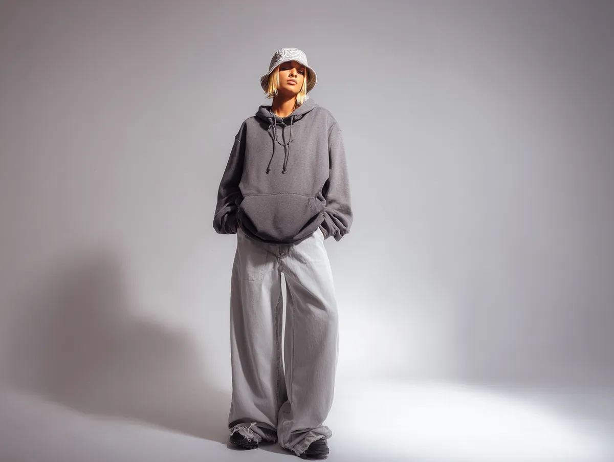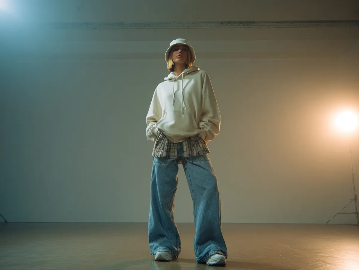 In the studio, a clean modern background strengthens the visual clarity of the look. Bright but soft lighting ensures that the textures of the hoodie and denim are captured without harshness. This lighting approach preserves the softness that defines much of the outfit’s charm. Photographers often position the model slightly off center to help create dynamic lines across the frame, making the wide leg denim appear even more fluid. This approach mirrors the editorial aesthetics often associated with 90s fashion ideas.