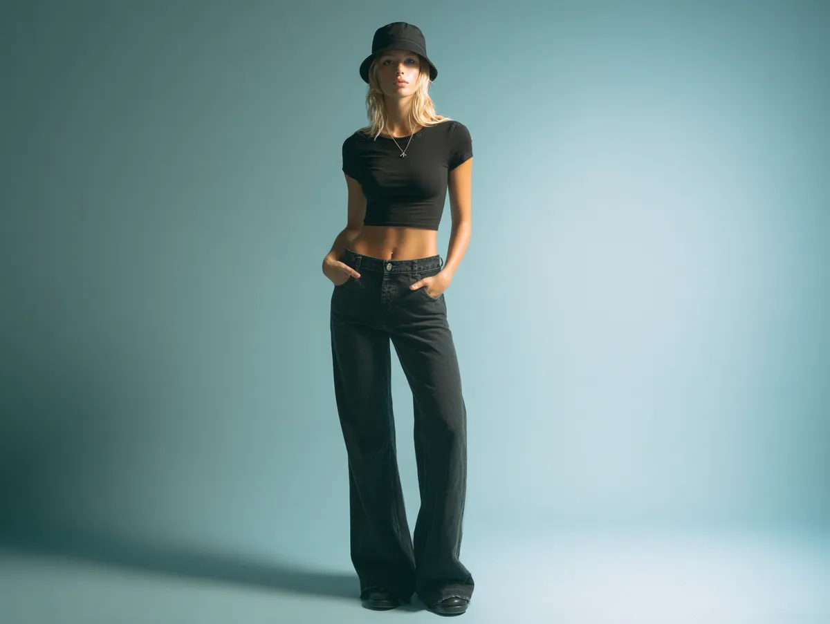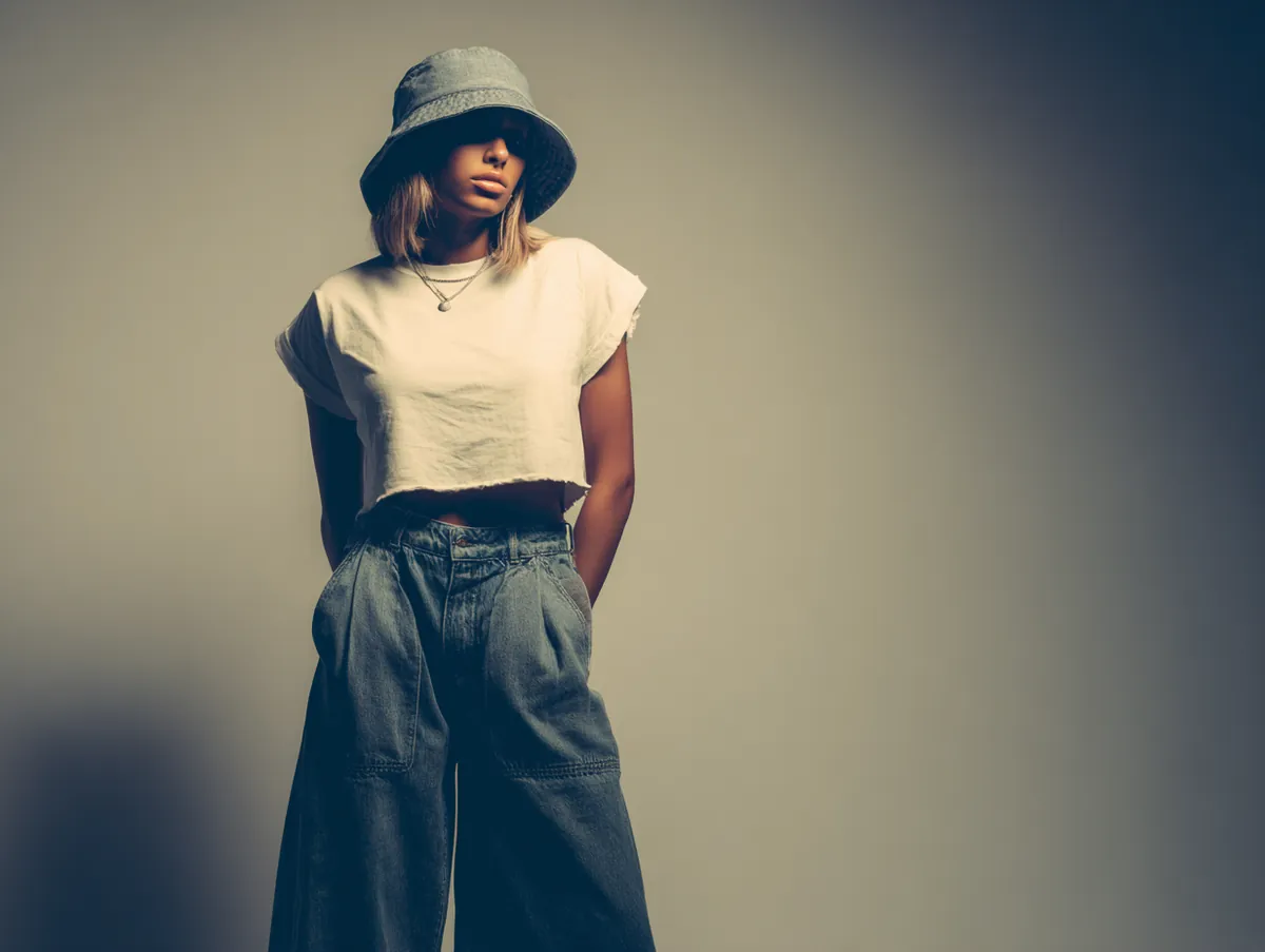 In a controlled studio environment, lighting becomes an essential part of how the outfit communicates its mood. Using a clean bright setup enhances the crisp edges of the denim while maintaining softness around the hat. Positioning light at slight angles introduces gentle shadows that help define the contours of wide leg shapes and highlight the textures of the cotton tee. A minimal backdrop gives the look room to stand out, echoing the uncluttered aesthetics of 90s inspired visuals. The result feels strong yet approachable, embodying the confident personality central to many 90s fashion ideas.