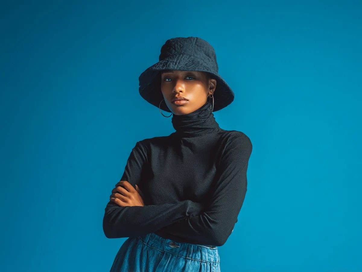 A structured bucket hat worn with a layered turtleneck and wide leg denim introduces a compelling blend of sophistication and casual appeal. The firm shape of the hat elevates the outfit by providing clear lines and strong form. This contrast between precision and looseness reflects the creative experimentation associated with 90s fashion ideas, demonstrating how timeless accessories can evolve into fresh contexts when paired with thoughtful layering techniques.