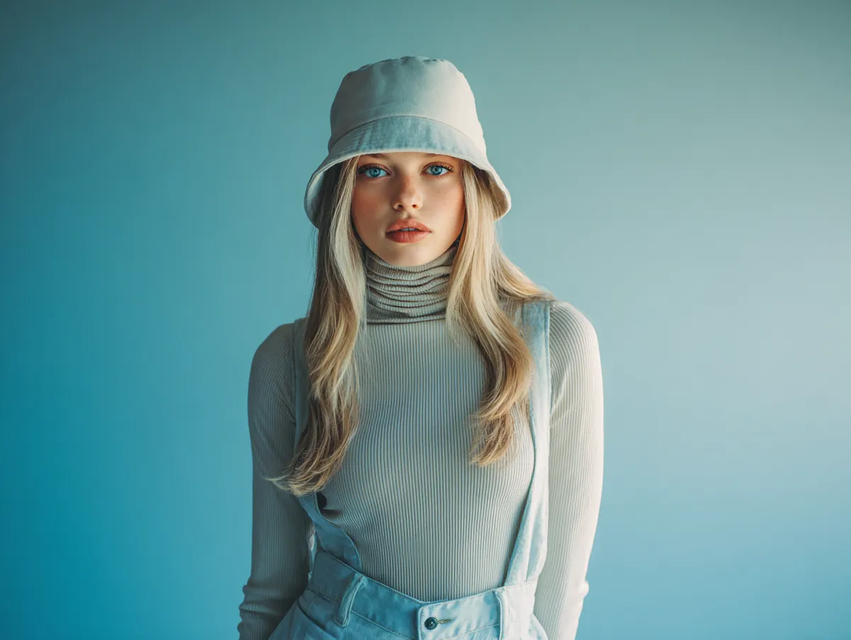 Within a controlled studio, lighting must highlight both the structured hat and the layered textures. A soft, diffused setup accentuates the turtleneck’s clean lines while allowing shadows to settle into the folds of the outer shirt. This combination produces a gentle interplay of depth across the outfit. Subtle backlighting helps separate the silhouette from the background, keeping attention on the precision of the shapes. These photographic techniques echo the clarity found in 90s fashion ideas, where simple backdrops allow clothing to stand at center stage.