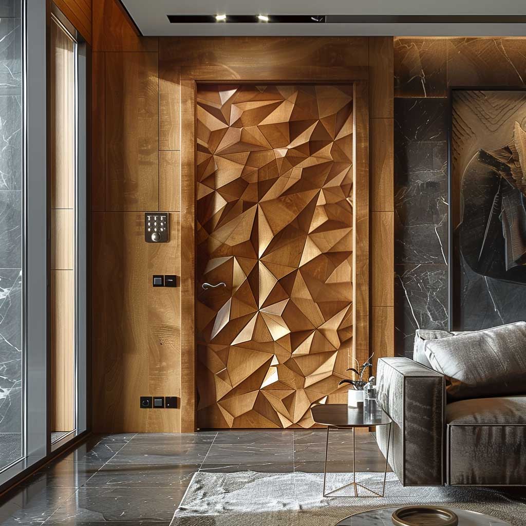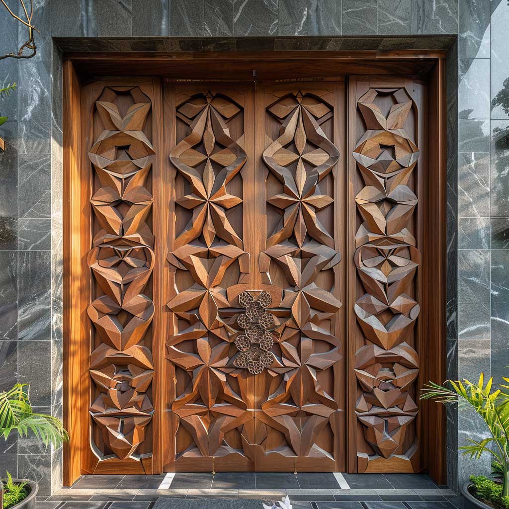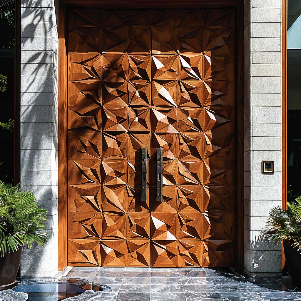 Picture a door with intricate geometric patterns, each line and angle carefully crafted to form a cohesive and captivating design. The symmetry and precision of the geometric shapes add a contemporary touch, making it an ideal choice for modern homes. The natural wood provides a warm contrast to the sharp lines of the carvings, creating a balanced and harmonious look.