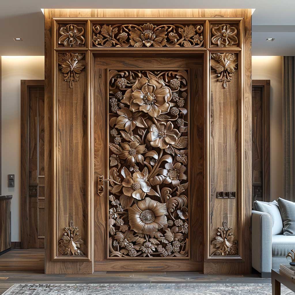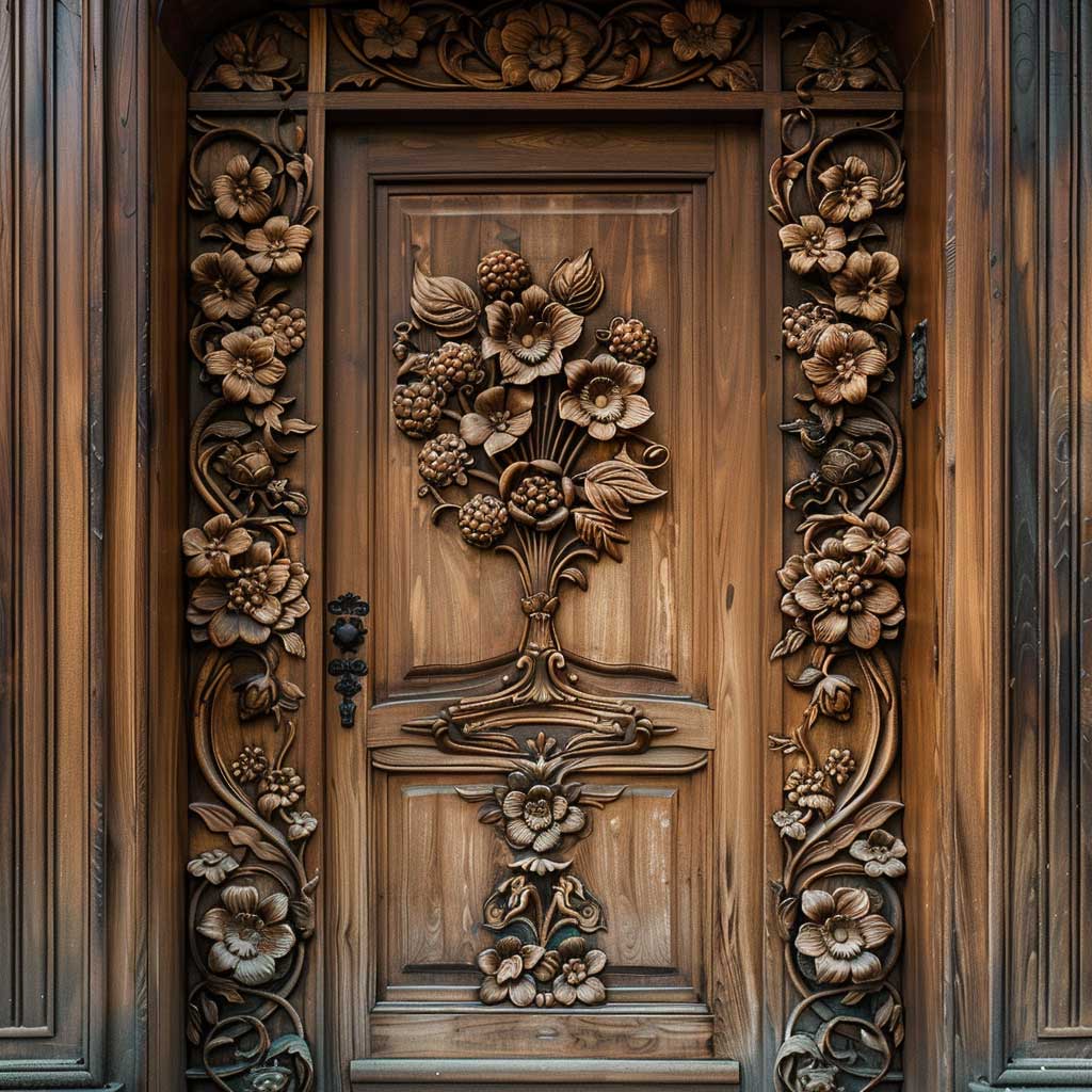 Imagine a door adorned with delicate floral patterns, each petal and leaf meticulously carved by skilled artisans. The natural wood serves as the perfect canvas, with its rich tones and textures enhancing the intricate details of the carvings. This type of door not only provides a grand entrance but also acts as a statement piece that reflects your appreciation for nature and craftsmanship.
