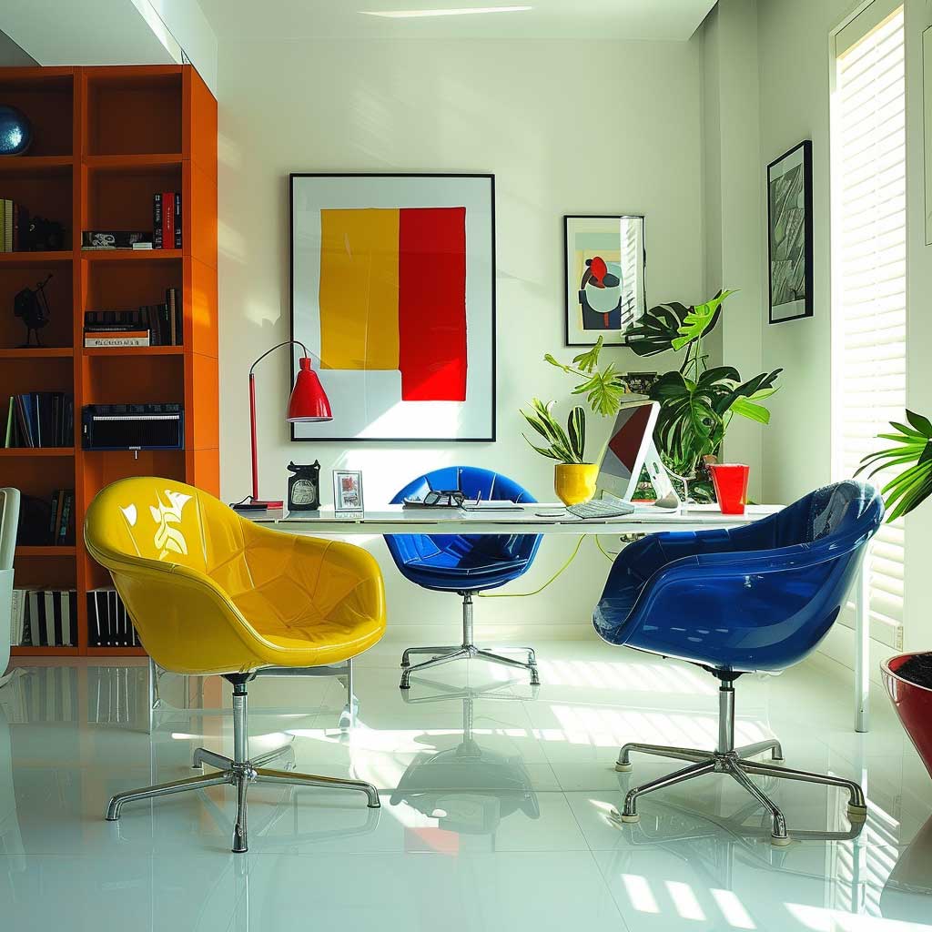 In this revitalized home office, the stark white walls act as a canvas, accentuating the furniture and decor that follow a primary color scheme. The choice of white for the walls is deliberate, providing a sense of openness and tranquility, against which the primary colors can make a more striking impact. A large, minimalist desk in bright yellow stands proudly at the center of the room, not just as a piece of furniture but as a statement of optimism and energy. Surrounded by blue chairs and red shelving units, the desk becomes the focal point, around which the dynamics of work and creativity unfold.