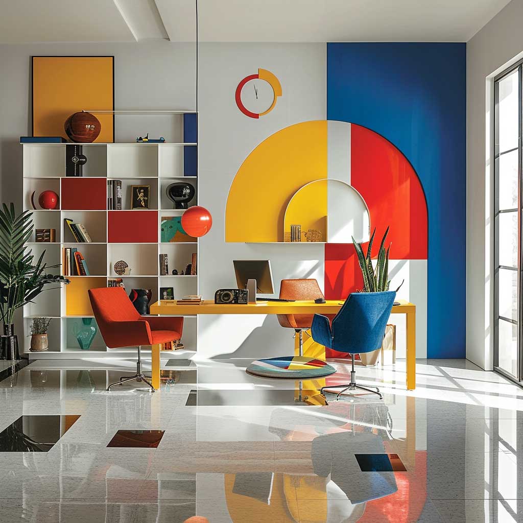 Furthermore, the Bauhaus influence extends beyond the color palette to the design of the furniture and layout of the office. The furniture is characterized by clean lines and geometric shapes, adhering to the Bauhaus principle of simplicity and utility. This minimalist approach ensures that the space remains uncluttered, promoting a sense of order and calm essential for concentration. The layout is carefully planned to maximize natural light, which interacts with the vibrant colors to create an ever-changing display that keeps the space feeling fresh and dynamic.