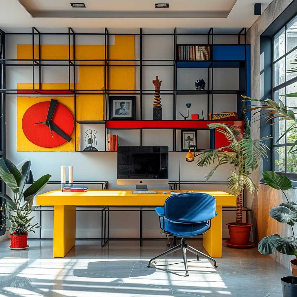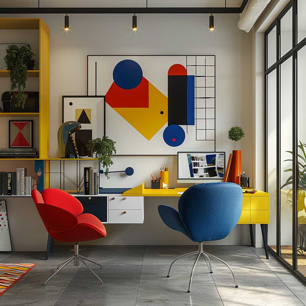 This home office, revitalized with a Bauhaus color palette, embodies the possibility of creating a workspace that is not only functional but also aesthetically stimulating. It demonstrates that the thoughtful application of color and design principles can transform mundane spaces into sources of inspiration and productivity. The use of a bold color palette for house interior, especially in a space dedicated to work, can have a profound effect on one’s mood and output. It stands as a testament to the power of design to influence our daily lives, reminding us that our environments play a crucial role in shaping our experiences and achievements.