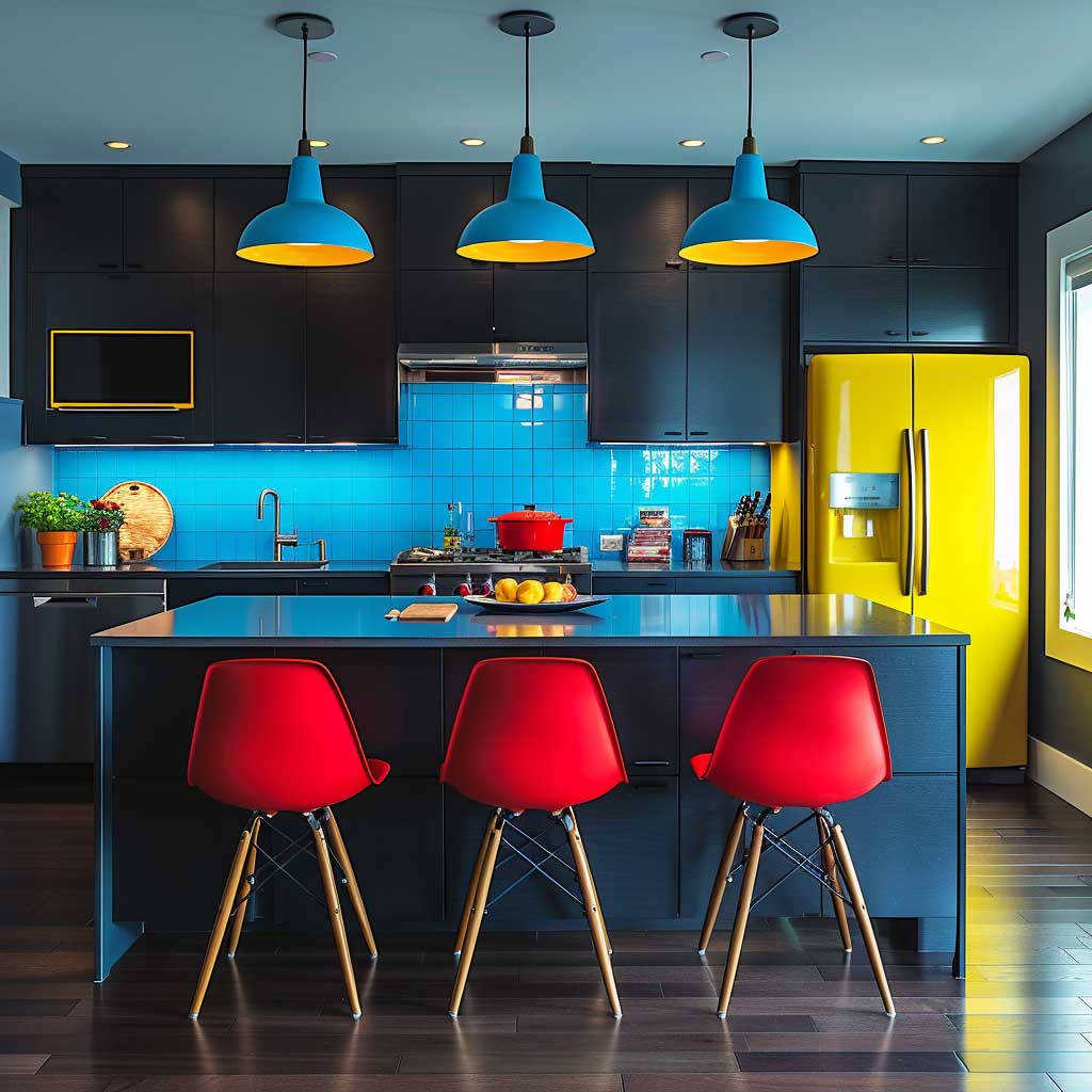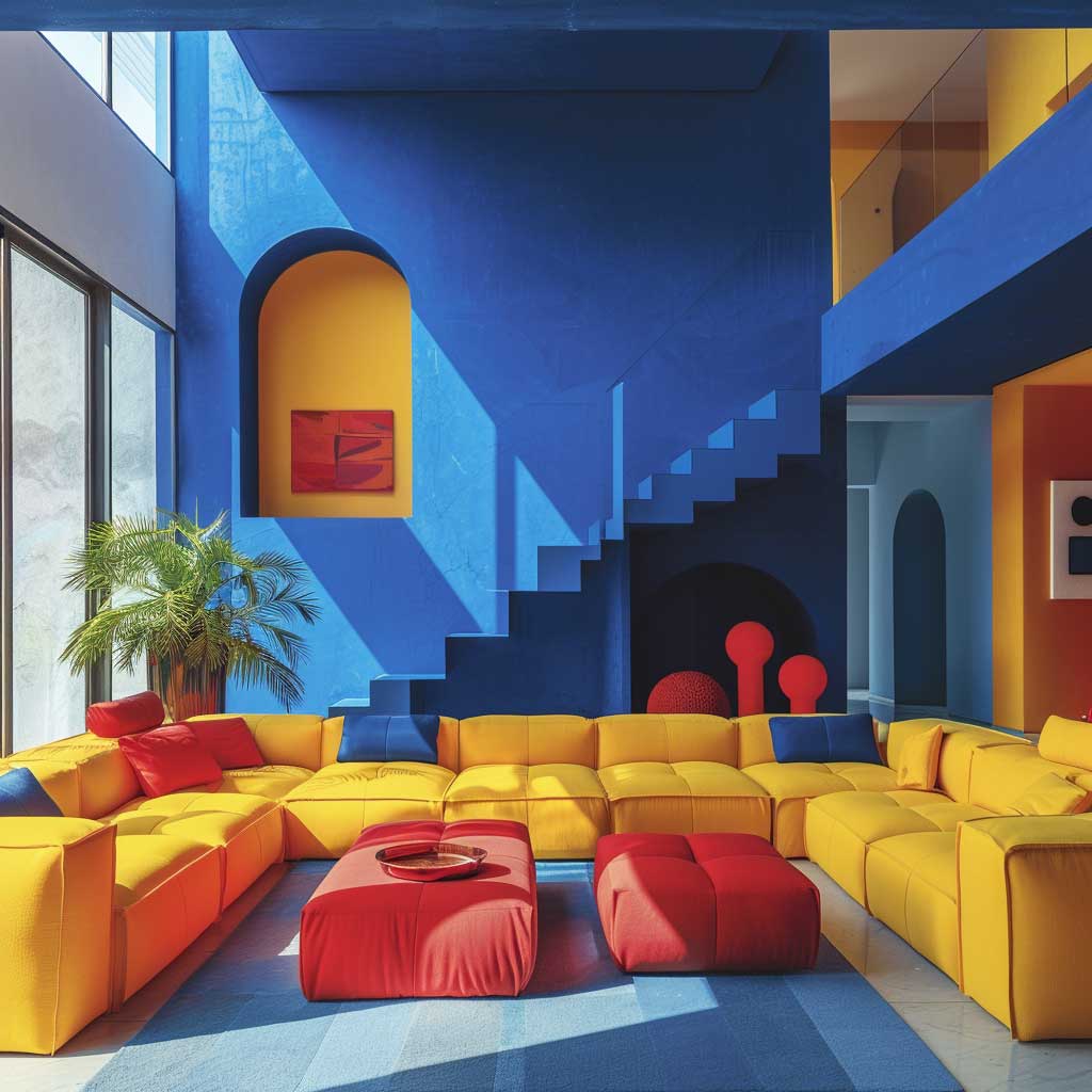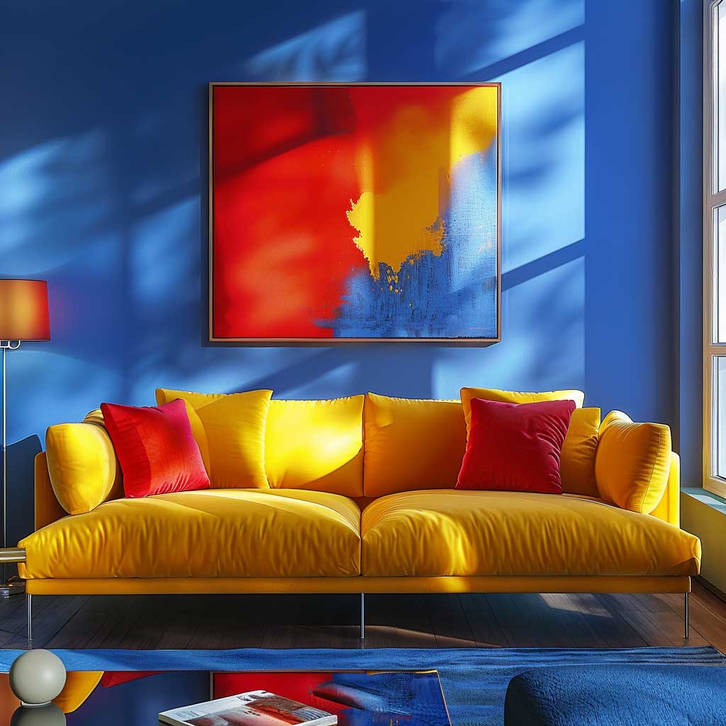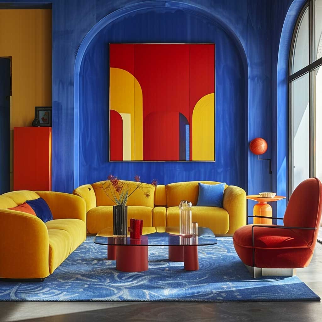 Imagine entering a room where the walls greet you with a bold blue hue, a color known for its calming yet profound depth. This choice of wall color immediately sets a dynamic backdrop, against which vibrant yellow furniture and red decorative pieces boldly stand. The contrast is striking, drawing the eye and stirring the imagination. Such a room is not just a space but a statement, a testament to the power of primary colors in shaping our living environments.