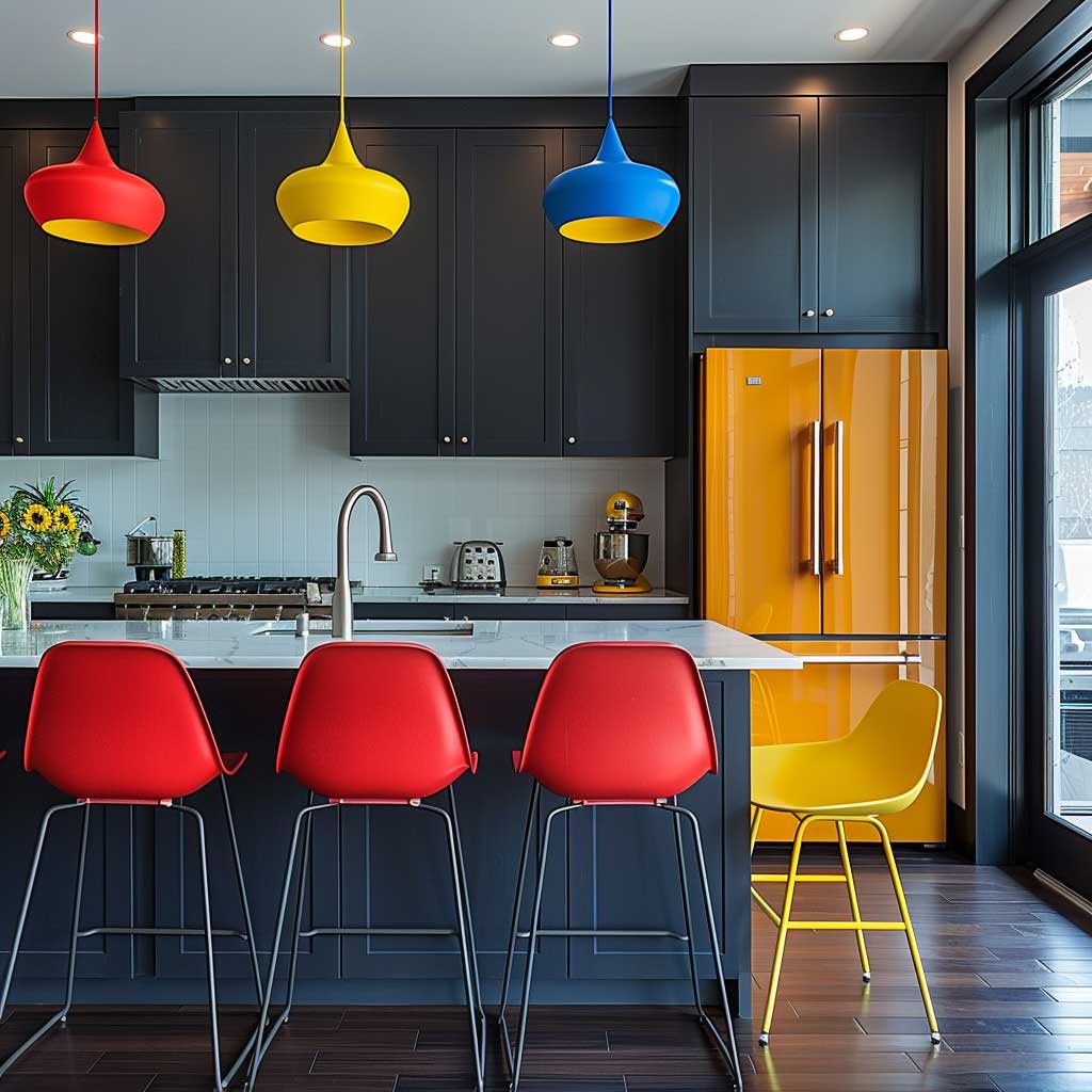 In this setting, furniture inspired by Bauhaus principles complements the vivid color scheme. Bauhaus, a movement that champions simplicity, functionality, and rationality in design, finds a harmonious match in the straightforwardness of primary colors. The furniture, characterized by clean lines and minimalist design, serves practical purposes while enhancing the aesthetic appeal of the room. The integration of Bauhaus-inspired pieces with the primary color palette highlights the room’s functionality without compromising its modern appeal.