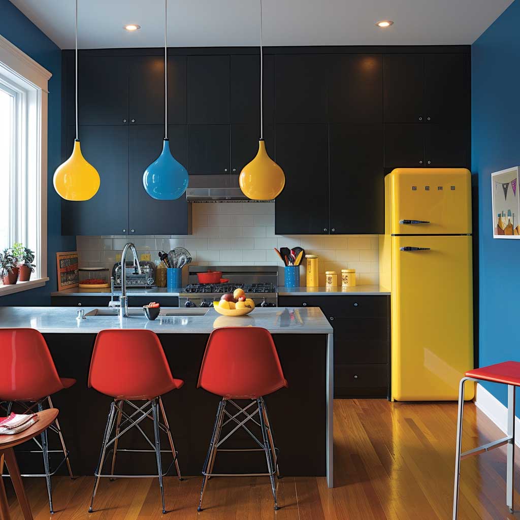 Central to this design philosophy is the kitchen cabinetry, finished in a sophisticated matte black. This choice serves as a grounding element, allowing the vibrancy of primary-colored accents to truly shine. Red chairs, a yellow refrigerator, and blue lighting fixtures become focal points, each contributing to the kitchen’s dynamic character without sacrificing its functional integrity. The stark contrast between the cabinetry and the colorful accents underscores the Bauhaus commitment to clarity and simplicity in design.