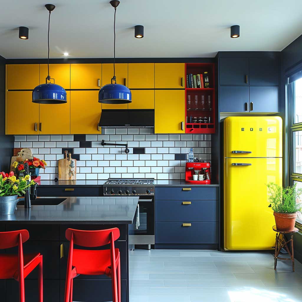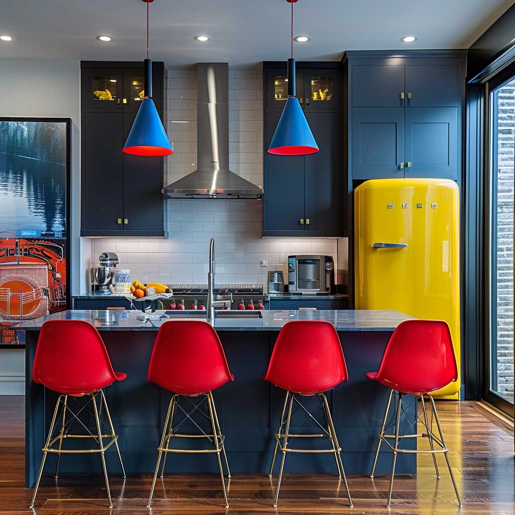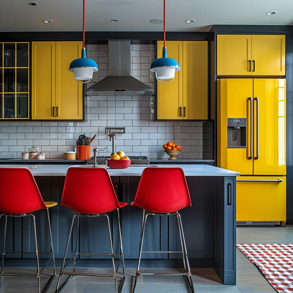The incorporation of a primary color palette in this Bauhaus-inspired kitchen does more than just enliven the space. It also serves as a reminder of the profound impact that color has on our perception of an environment. Red stimulates appetite and passion, blue evokes calmness and serenity, while yellow brings warmth and energy. Together, these colors create an atmosphere that is both inviting and inspiring, perfectly suited to the heart of the home.