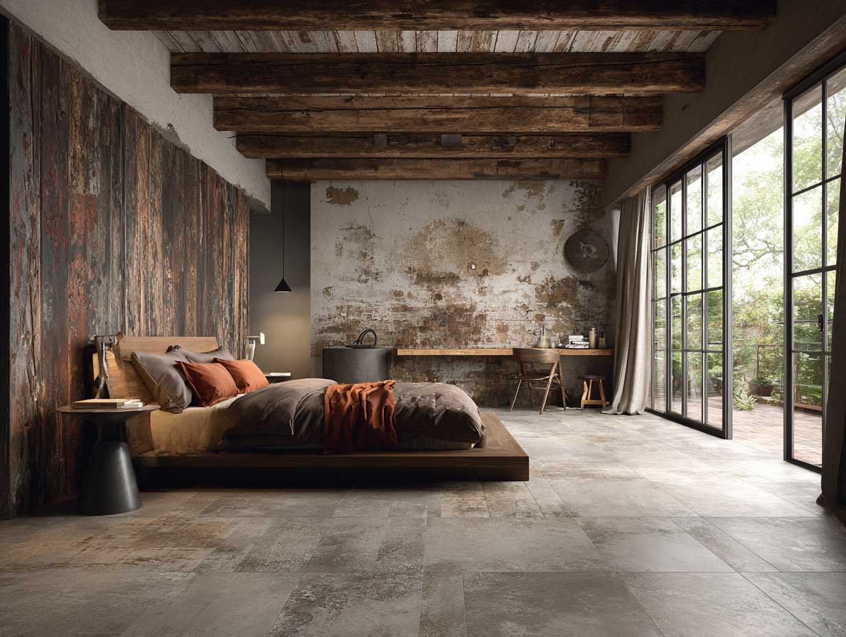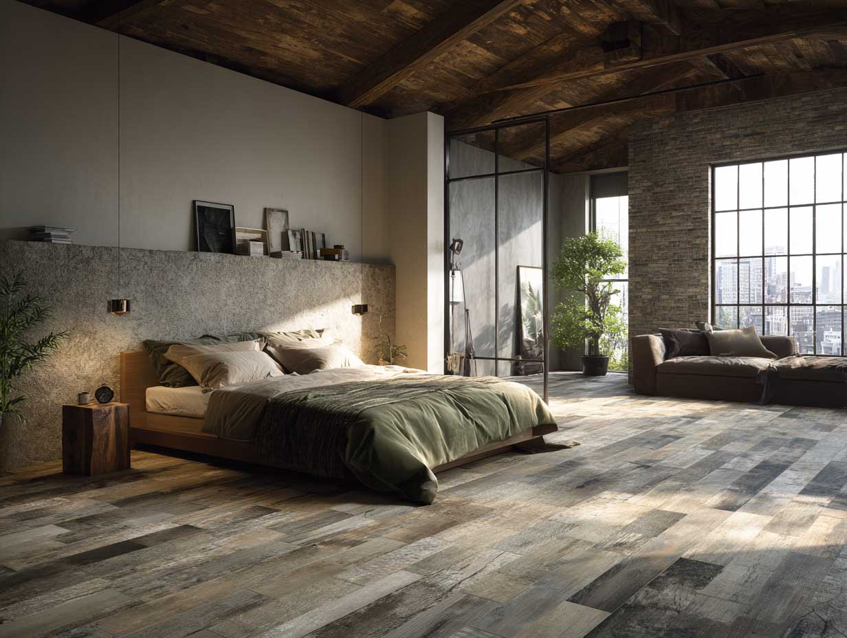 For a loft-inspired room that leans into light while retaining its raw edge, whitewashed wood-look tiles are an unexpected but powerful choice. This bedroom floor tiles design adds texture and brightness while echoing the urban loft’s love for visible wear and authentic surfaces. The weathered look feels lived-in without being neglected—worn, but not weary.