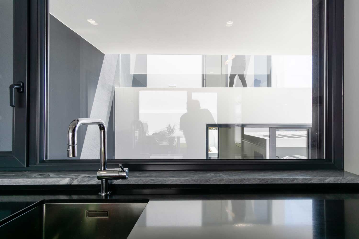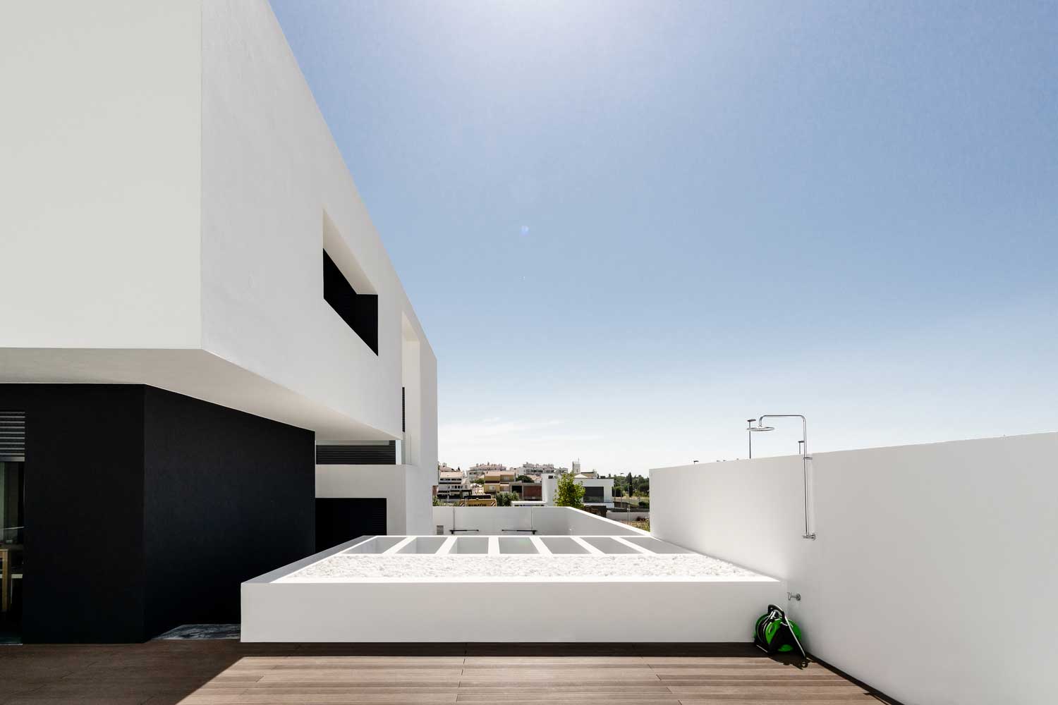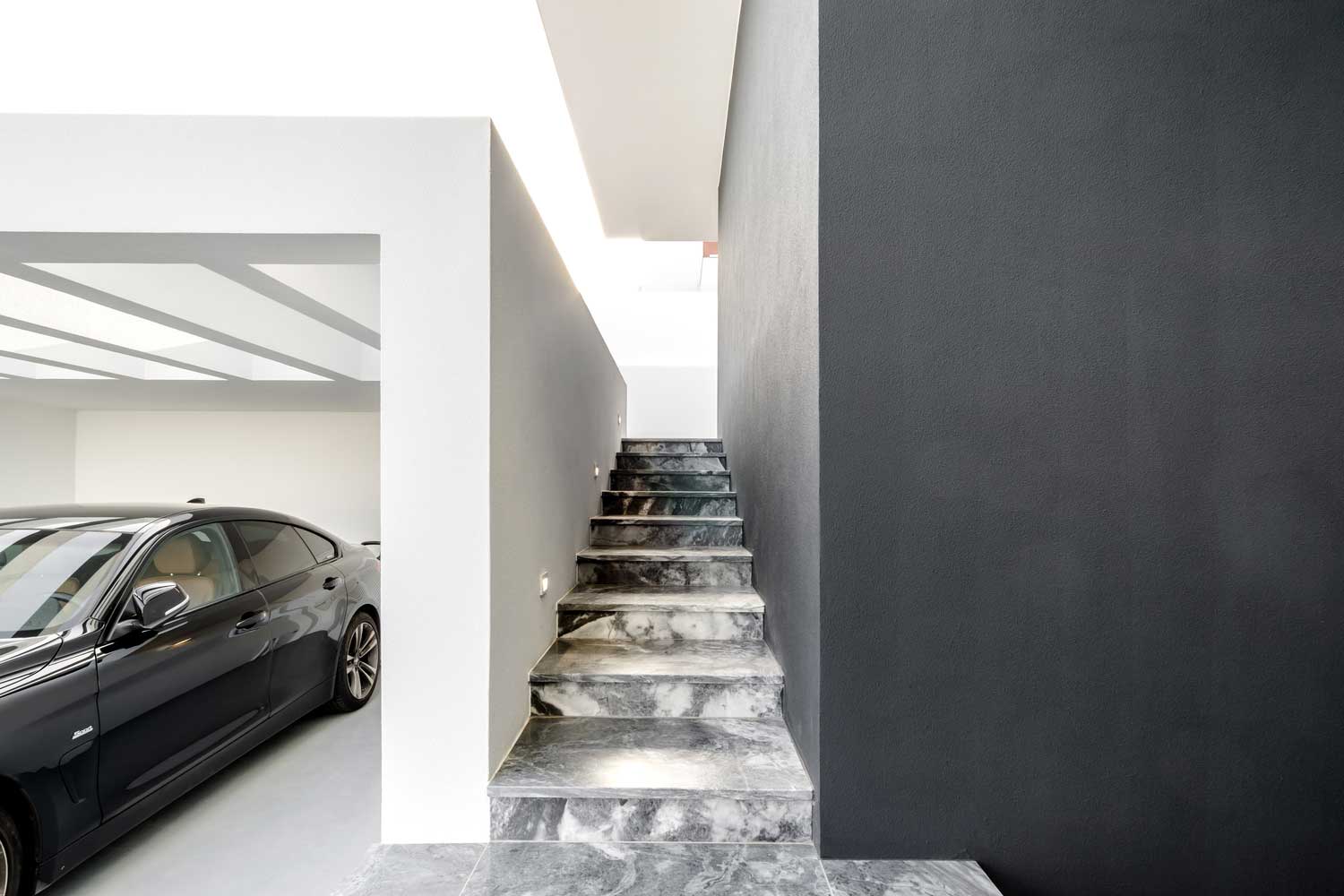 The black and white design of the two-story house from the outside continues smoothly into the interior. Here they used the same tones as in the design of the facades, the local area. Due to this concept, it was possible to integrate the internal living space with the outside. Sheds, terraces, walkways, arches made it possible to closely intertwine elements of the exterior and interior of the house. First, you find yourself under the overhanging floor, and then into the house itself.