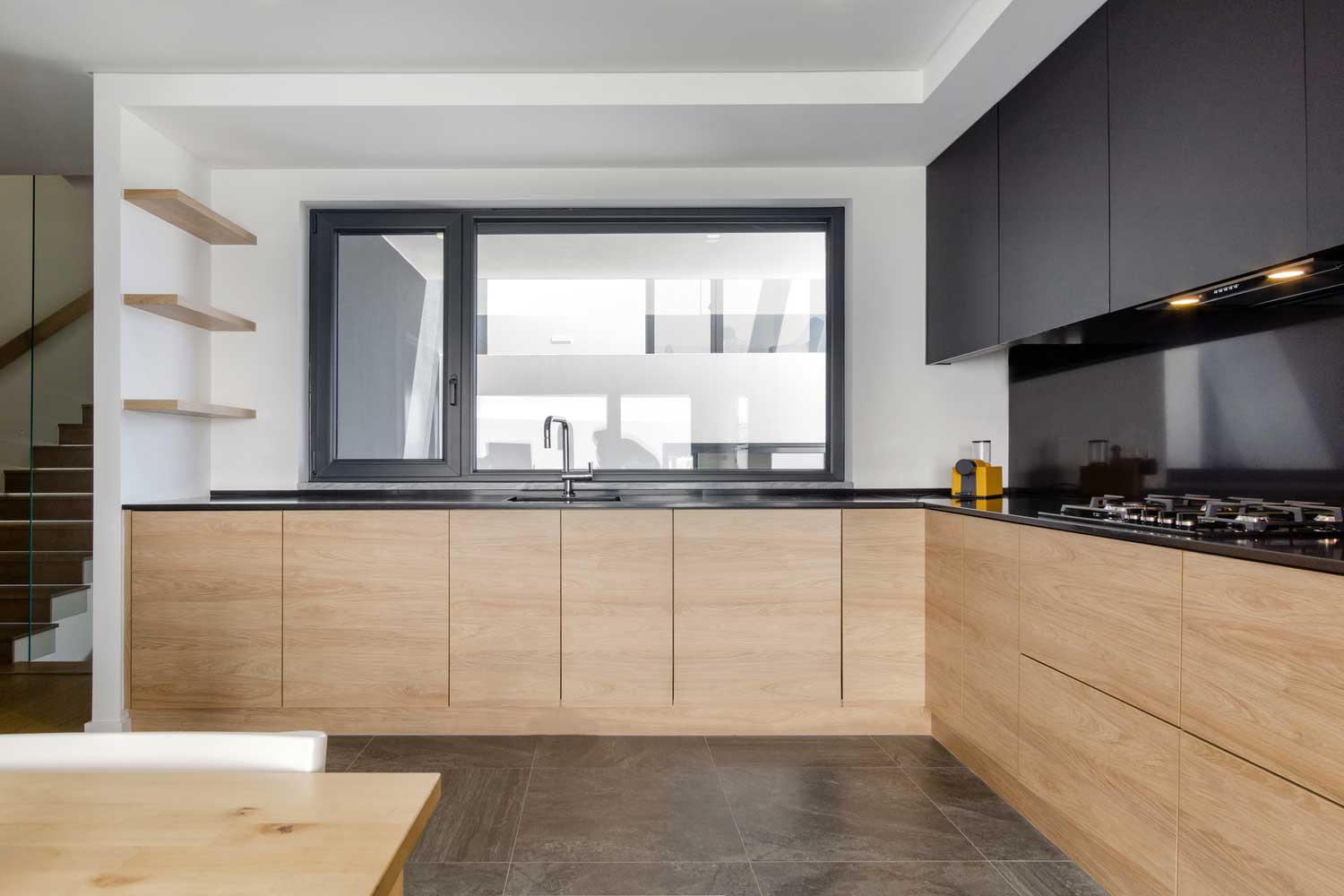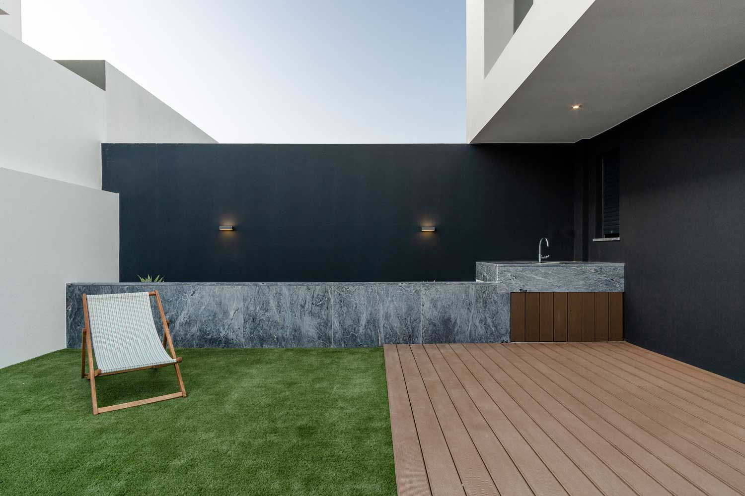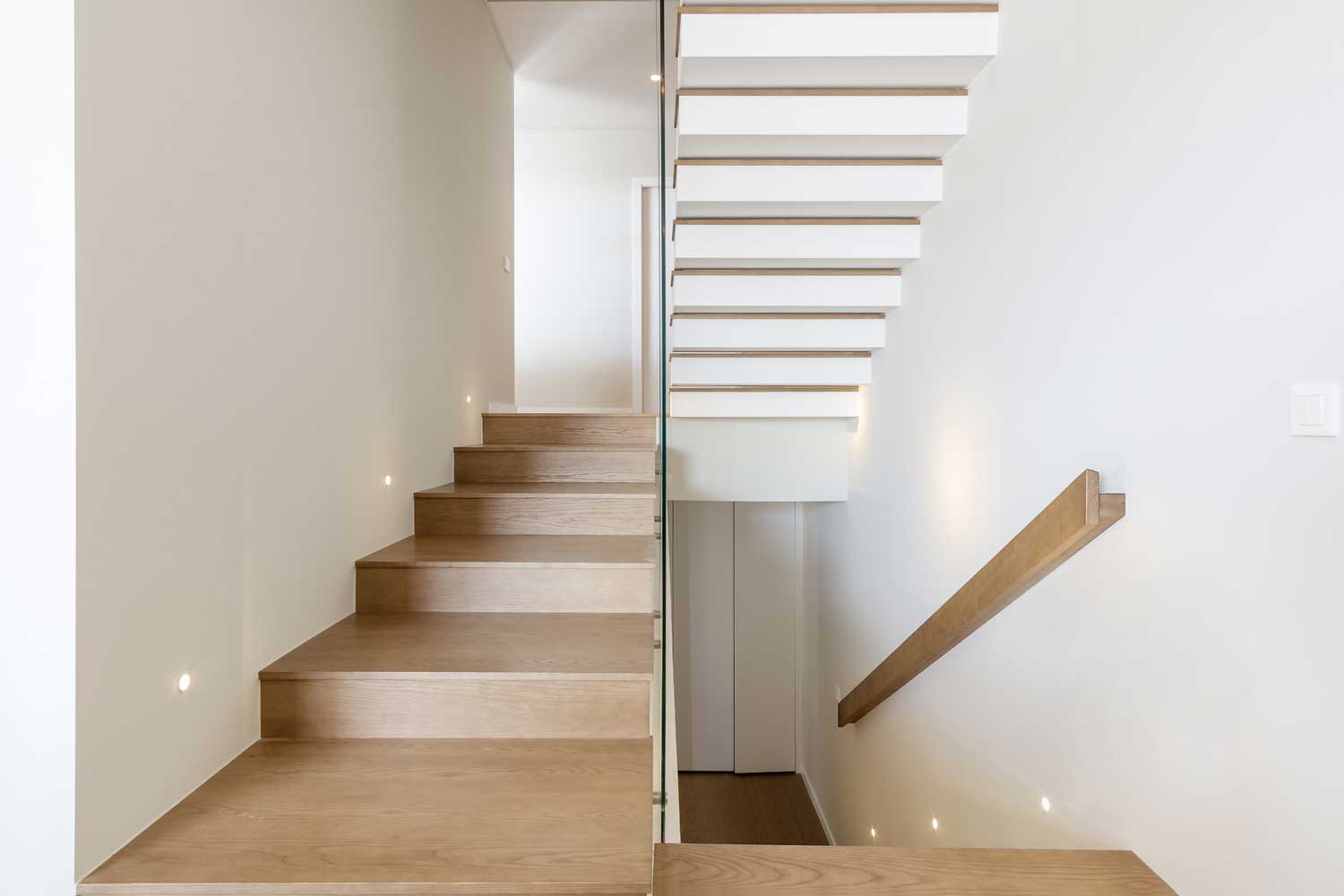 The black and white design of the two-story house from the outside continues smoothly into the interior. Here they used the same tones as in the design of the facades, the local area. Due to this concept, it was possible to integrate the internal living space with the outside. Sheds, terraces, walkways, arches made it possible to closely intertwine elements of the exterior and interior of the house. First, you find yourself under the overhanging floor, and then into the house itself.