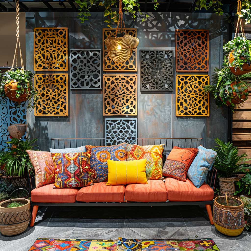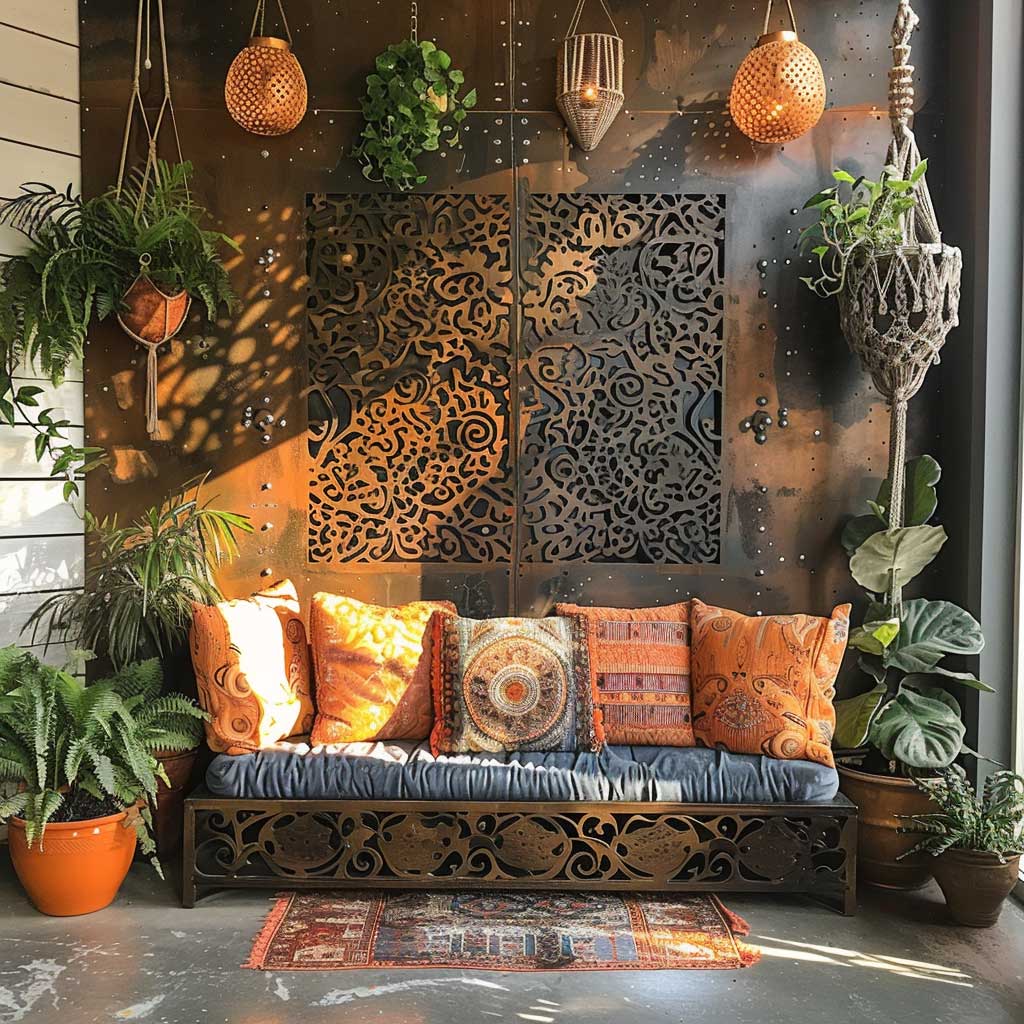 Bohemian decor is all about breaking free from traditional design rules and embracing creativity and individuality. The introduction of metal design panels into such a decor scheme adds a surprising element of modernity that complements the bohemian spirit. These panels, used as creative backdrops in living spaces, bring an artistic touch with their unique patterns and designs, transforming the wall they adorn into a statement piece.