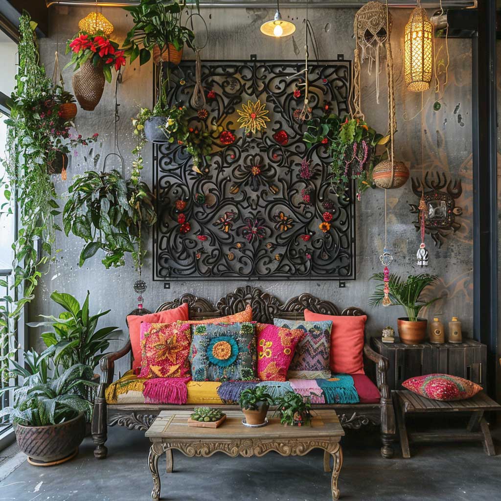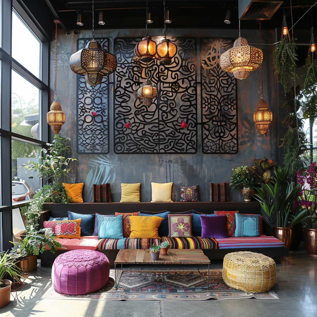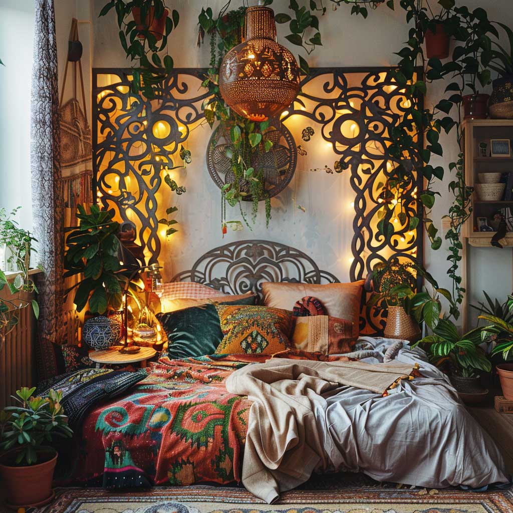 In a space defined by its bohemian decor, every item has a story to tell, and the metal panels are no exception. They stand as a testament to the fusion of creativity and innovation, where the industrial meets the artisanal. The cut-out designs in the metal panels allow light to pass through, creating playful shadows that add depth and movement to the room. This interaction between light and metal adds a dynamic quality to the space, making it feel more open and inviting.