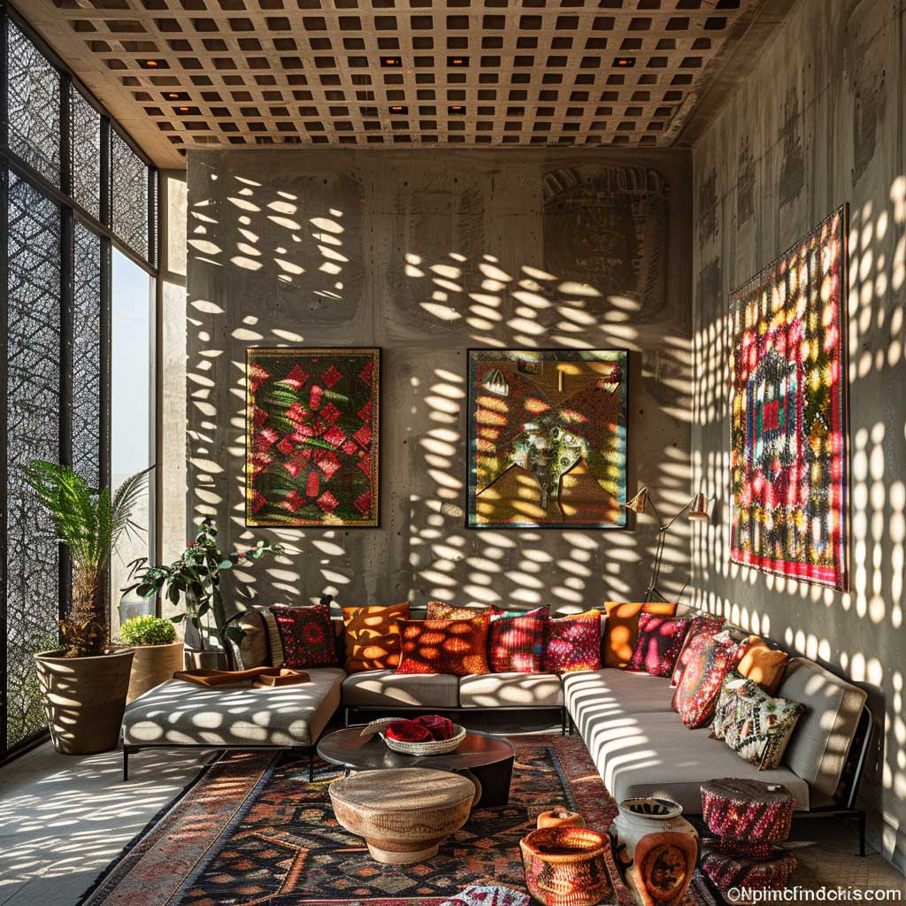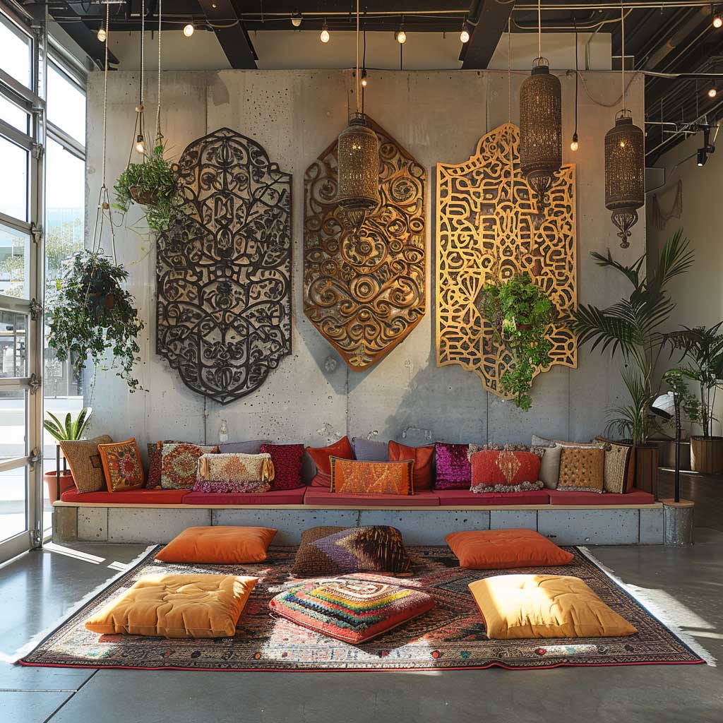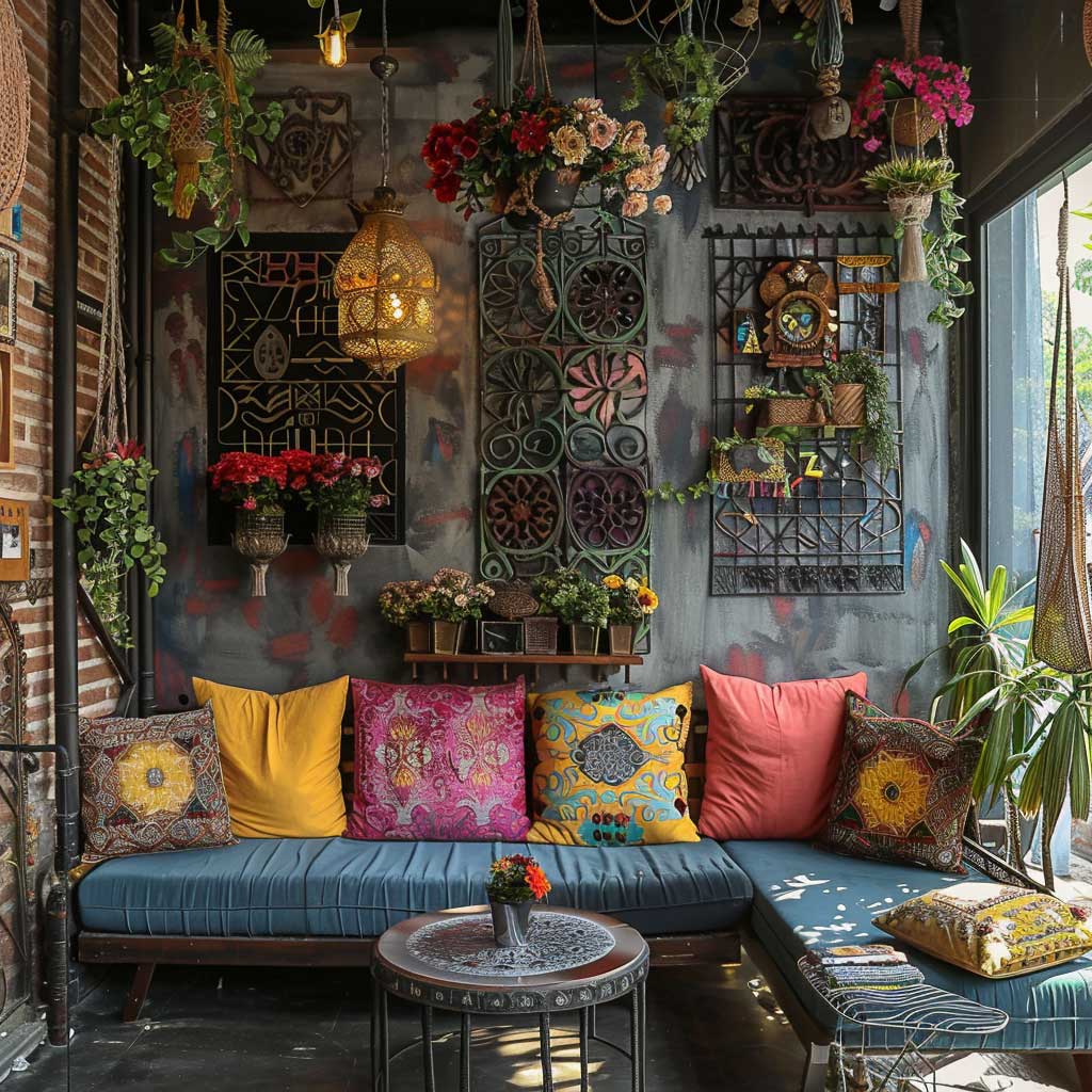 In a space defined by its bohemian decor, every item has a story to tell, and the metal panels are no exception. They stand as a testament to the fusion of creativity and innovation, where the industrial meets the artisanal. The cut-out designs in the metal panels allow light to pass through, creating playful shadows that add depth and movement to the room. This interaction between light and metal adds a dynamic quality to the space, making it feel more open and inviting.