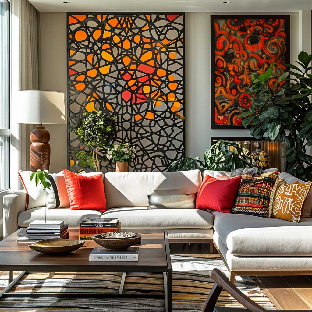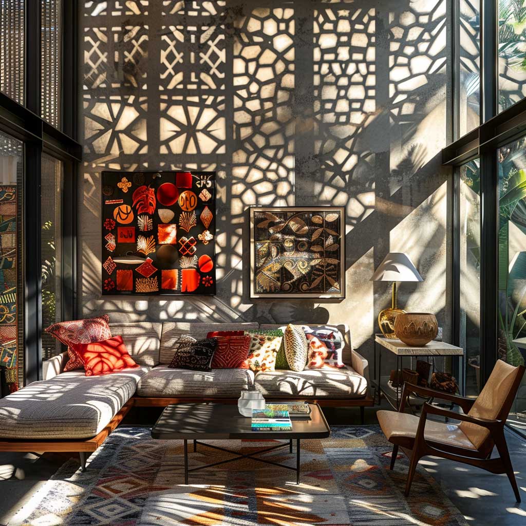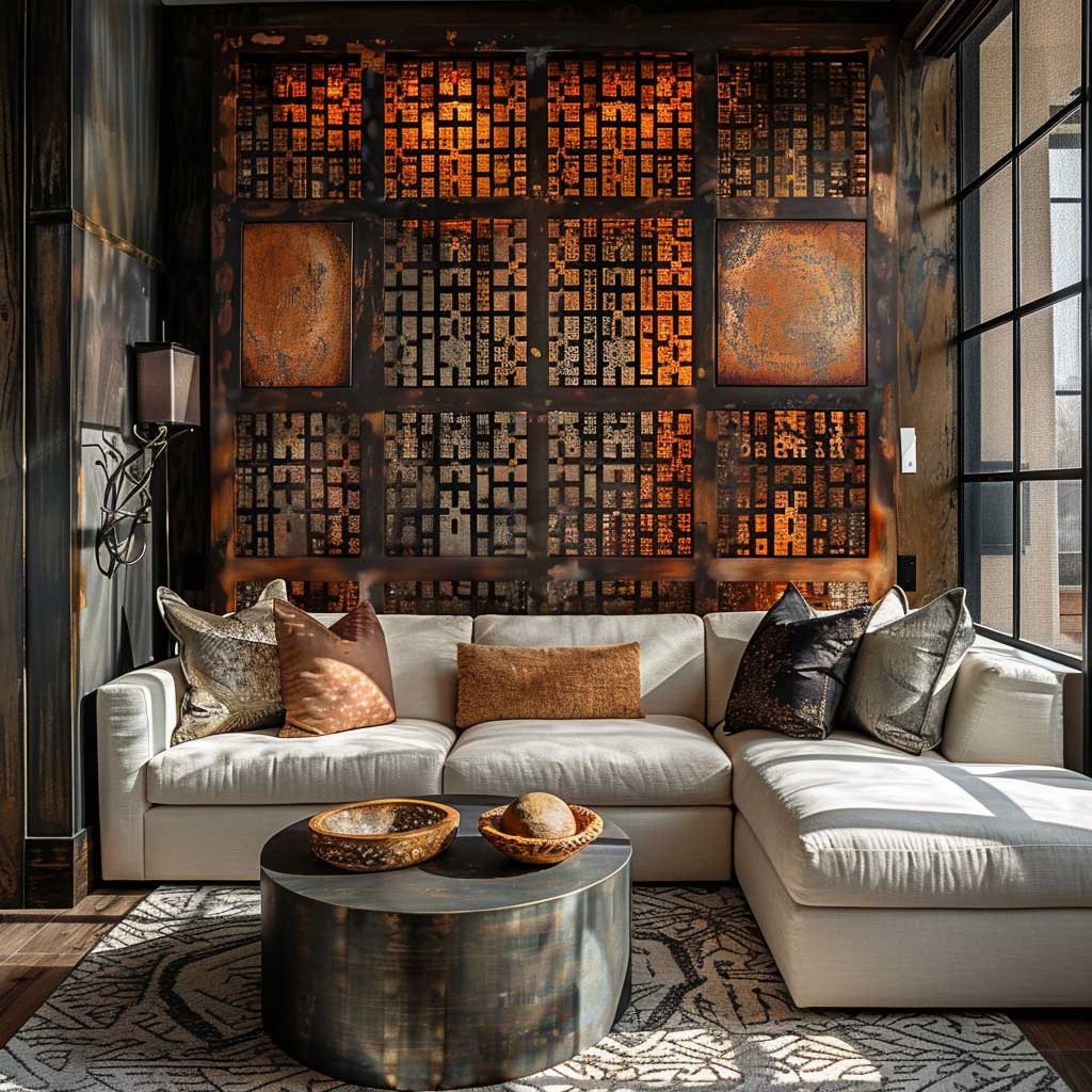 The choice of metal design panels in an eclectic living space is a deliberate one, aimed at creating contrast and capturing attention. The way these panels interact with light adds a layer of visual interest to the room, casting shadows and reflections that change throughout the day, making the space feel alive and ever-evolving. Against this backdrop, mid-century modern furniture finds a contemporary context, while global textiles and bold art pieces inject color and personality into the room.