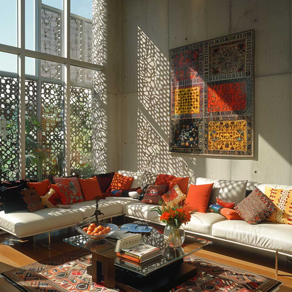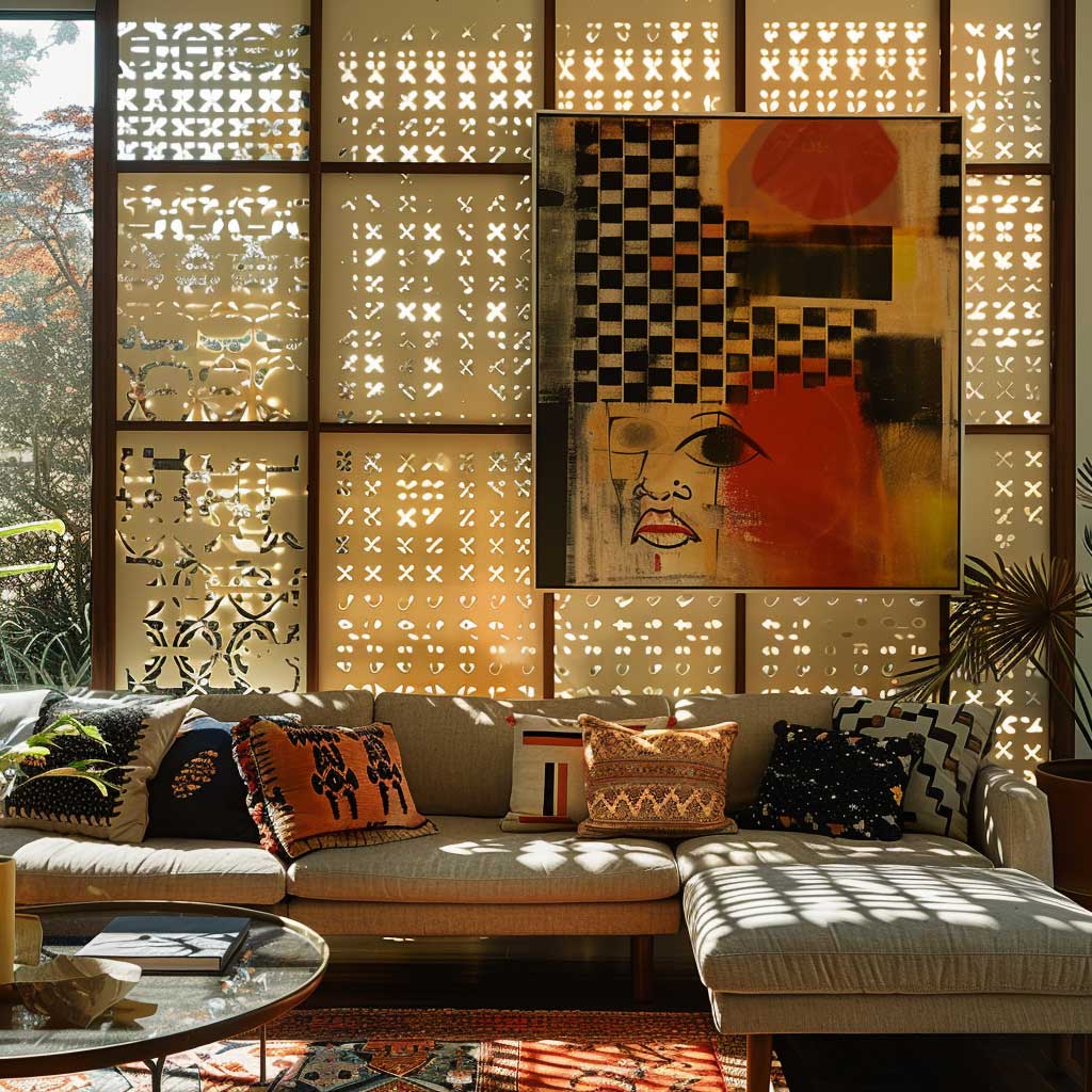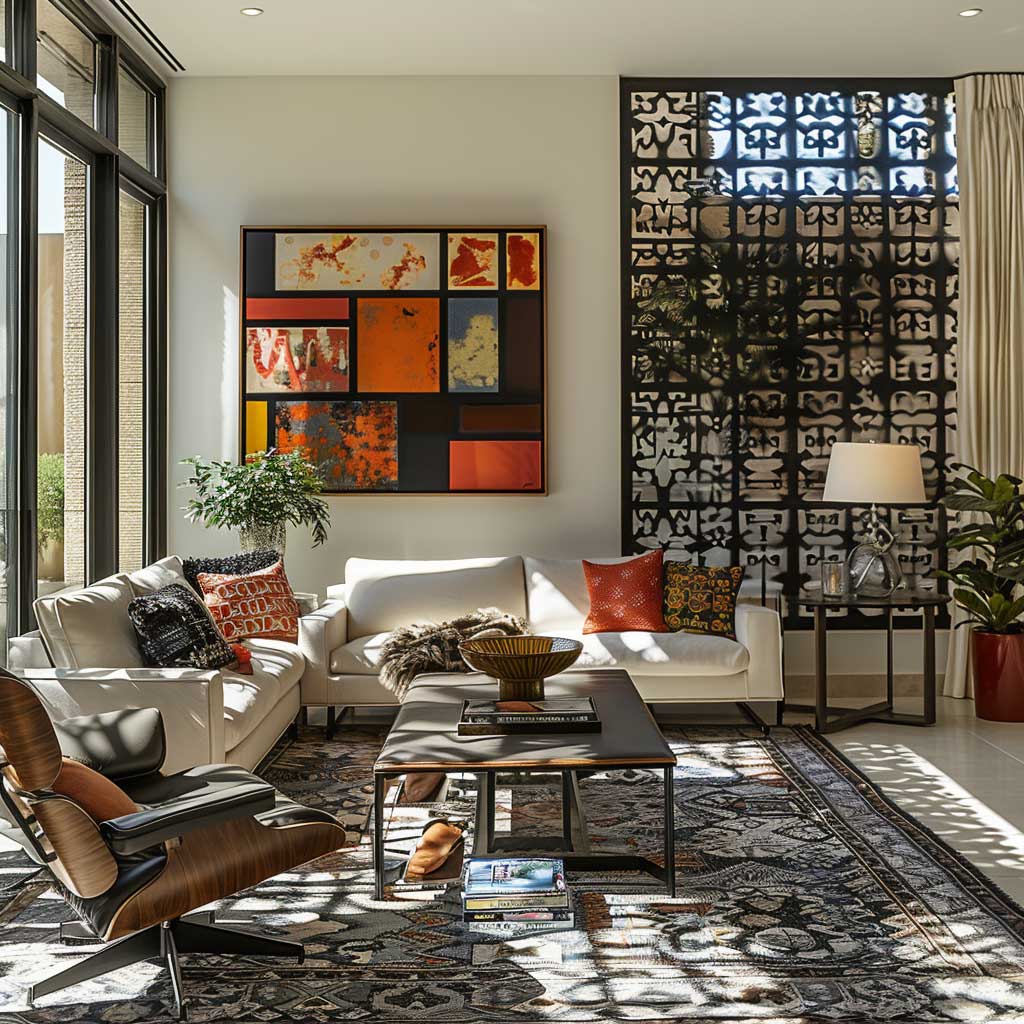 The choice of metal design panels in an eclectic living space is a deliberate one, aimed at creating contrast and capturing attention. The way these panels interact with light adds a layer of visual interest to the room, casting shadows and reflections that change throughout the day, making the space feel alive and ever-evolving. Against this backdrop, mid-century modern furniture finds a contemporary context, while global textiles and bold art pieces inject color and personality into the room.