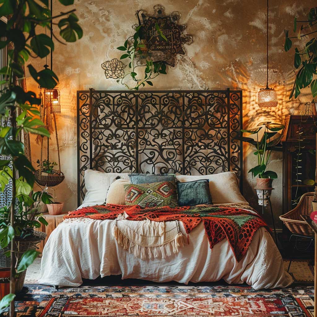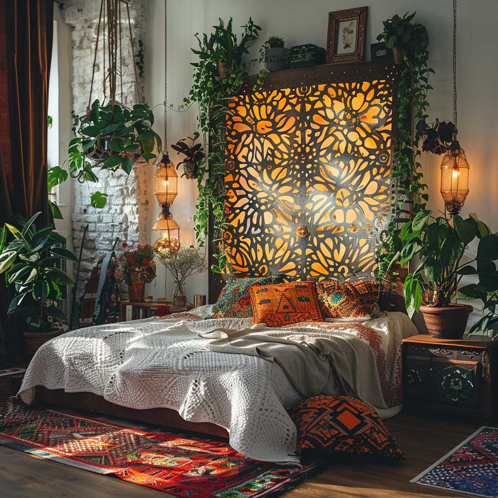 The incorporation of metal design panels as headboards in a bohemian bedroom is a testament to the versatility and adaptability of metal as a material in interior design. Unlike the traditional use of metal in more industrial or minimalist decor, here it is transformed into intricate patterns and designs that echo the bohemian spirit of freedom and creativity. These panels are not mere functional elements; they are pieces of art that catch the light, creating a luminous backdrop that enhances the warmth and coziness of the bedroom.