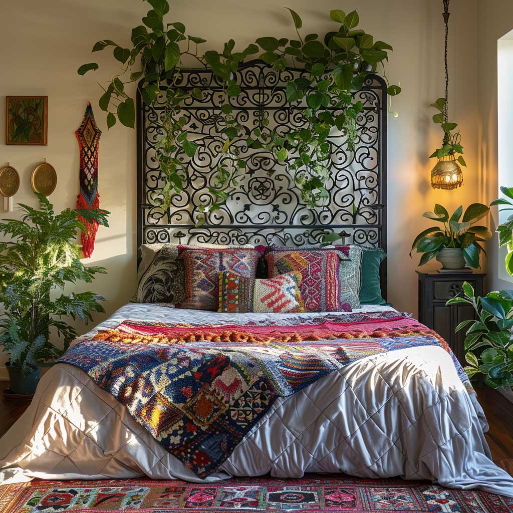 Surrounding the metal panels, the room bursts into life with lush plants that breathe vitality into the space, vibrant textiles that tell stories of faraway lands, and eclectic decorations that showcase a collection of life’s journeys. The soft bedding, adorned with colorful patterns, invites relaxation and dreams, while the rugs underfoot add texture and a splash of color, grounding the room in comfort.