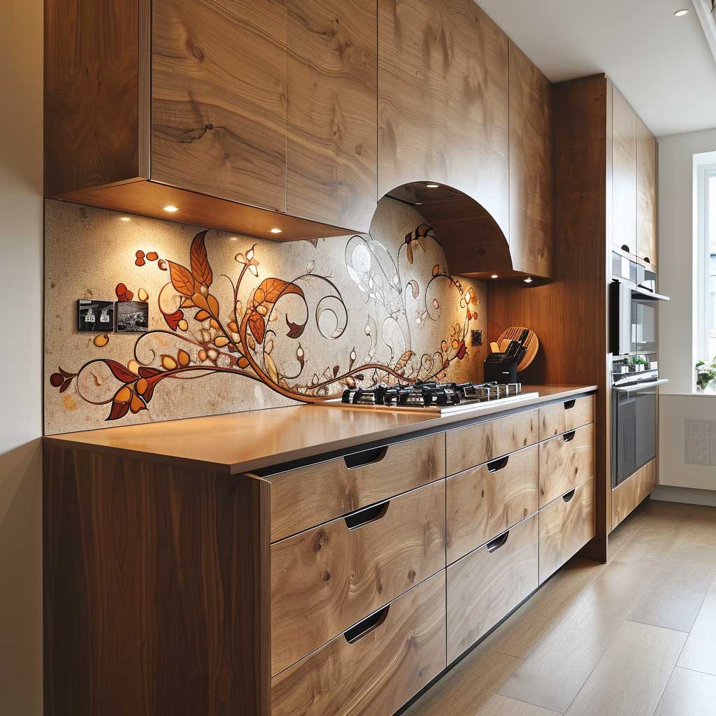 The backsplash is another area where Art Nouveau influence shines. Tiles featuring nature-inspired designs, such as leaves, vines, or floral patterns, add an artistic touch while maintaining modern functionality. These could be in muted colors to blend with a contemporary color scheme or in bolder hues for a more dramatic effect.
