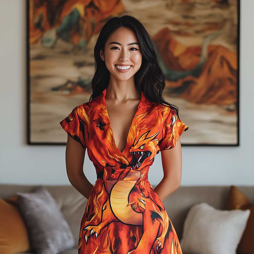 Wearing a dress like this is not just about following trends; it’s about embracing your boldness and letting your personality shine through. The combination of red and Pokémon artwork, especially with a character as iconic as Charizard, speaks to a desire to stand out and be noticed. It’s a look that is as fierce and powerful as the Pokémon itself, perfect for those who are not afraid to make a statement.