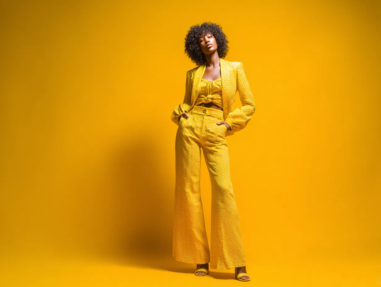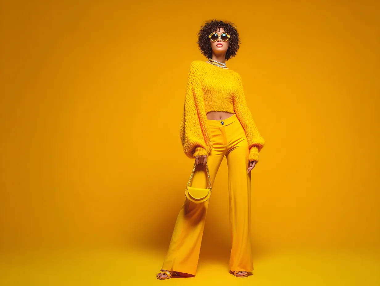 Bell-bottoms are iconic of 70s fashion, and yellow bell-bottoms can add a bold and playful element to your wardrobe. Imagine a pair of yellow bell-bottoms paired with a fitted top and accessorized with a headscarf, creating a striking silhouette that exudes retro charm. This look is perfect for everyday wear, combining comfort with standout style.