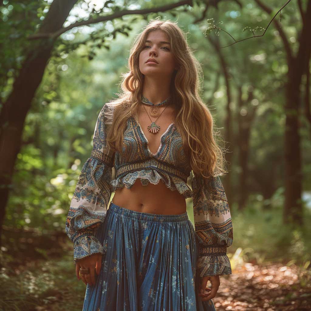 A flowy blue maxi skirt is a beautiful representation of the boho style that was prevalent in 70s fashion ideas. Picture a model in a full-length photo, wearing a flowy blue maxi skirt paired with a peasant blouse, posing in a lush park. This outfit captures the carefree and relaxed spirit of the 70s boho style.