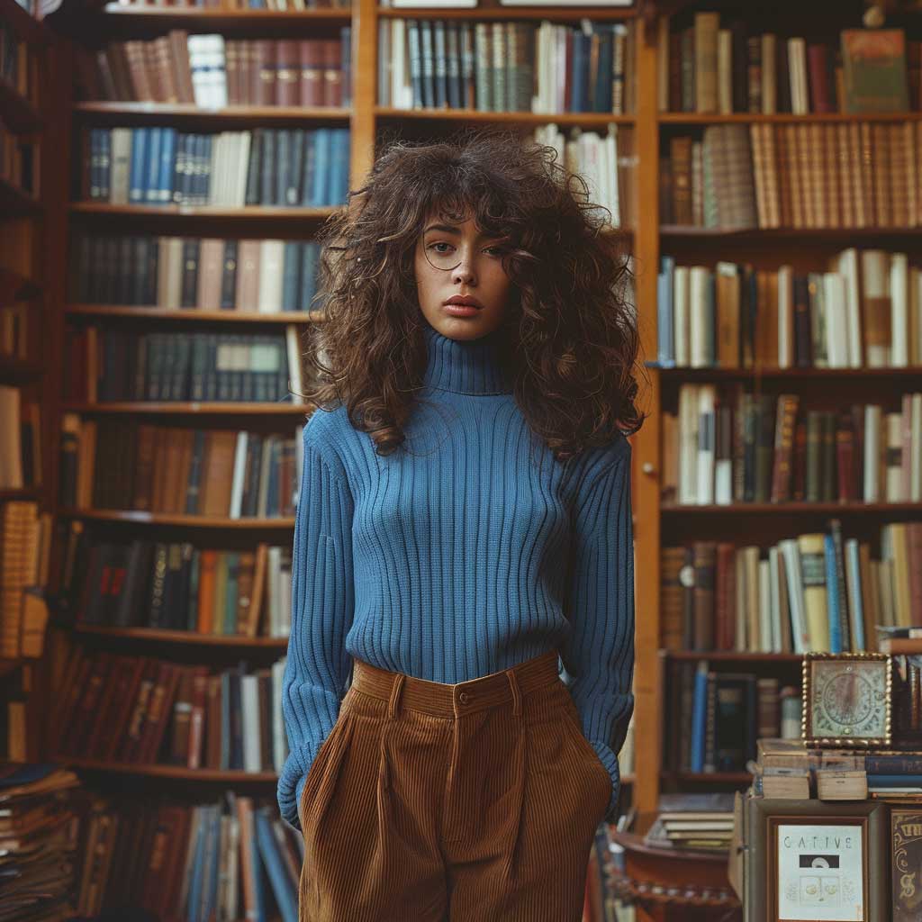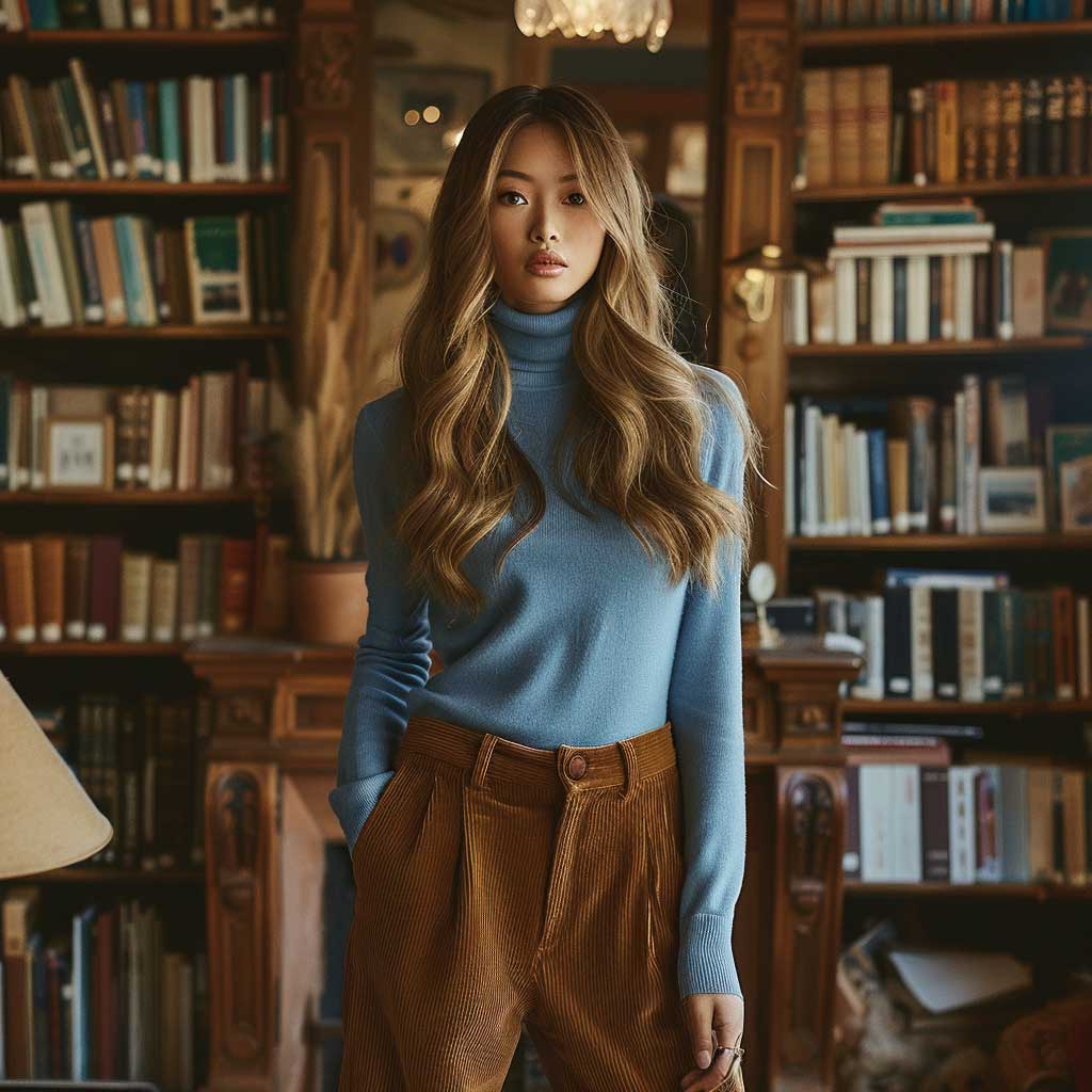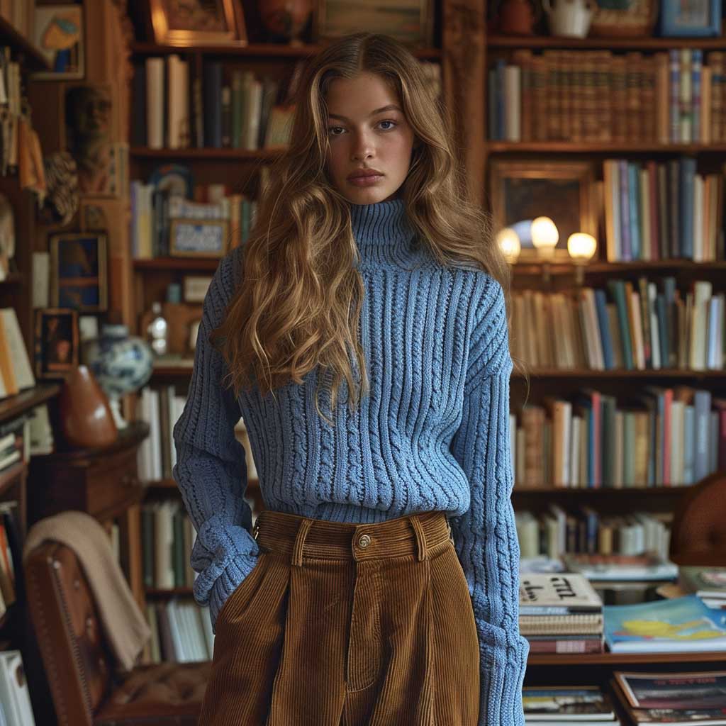 A vintage bookstore setting, with its shelves of old books and nostalgic ambiance, provides the perfect backdrop for this outfit. The blue turtleneck and brown corduroy pants create a harmonious and visually appealing contrast, making the model stand out. This look is ideal for casual days at the library, coffee shop visits, or even a relaxed day at work, offering both comfort and style.