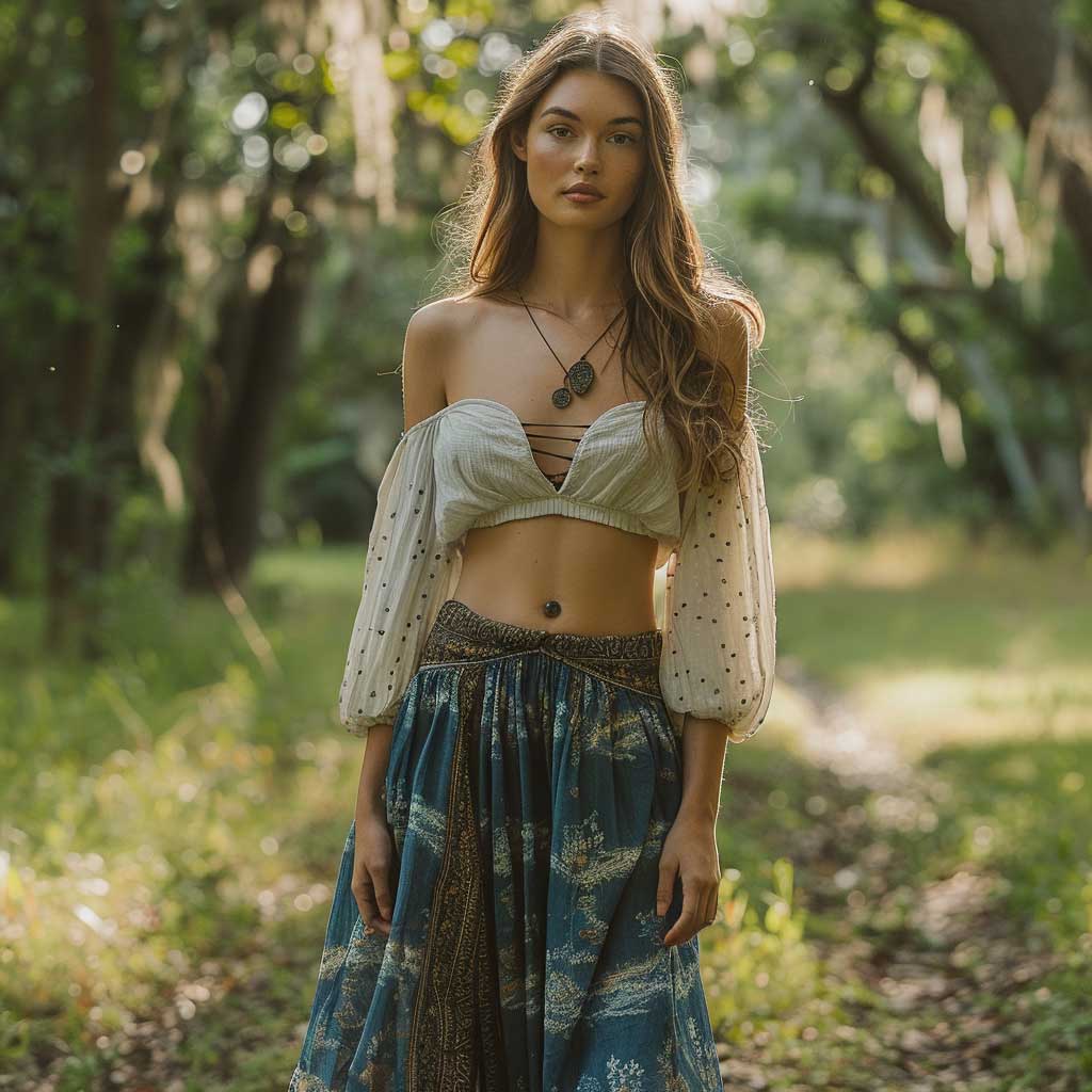 The blue maxi skirt, with its soft, flowing fabric, creates a graceful and feminine silhouette. Paired with a white peasant blouse, the outfit exudes a sense of effortless elegance. The blouse, with its loose fit and intricate embroidery, adds a touch of vintage charm. This look can be accessorized with a wide-brim hat, beaded necklaces, and flat sandals to enhance the boho vibe.