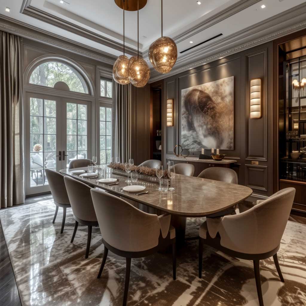 The dining room, a place of gathering and celebration, becomes a canvas for artistic expression when infused with modern baroque interior design. This style, a blend of the ornamental richness of the baroque period with the sleek lines of contemporary design, creates a dining space that is both majestic and welcoming. The modern baroque dining room is where the drama of history meets the clarity of modernity, resulting in a truly unique dining experience.